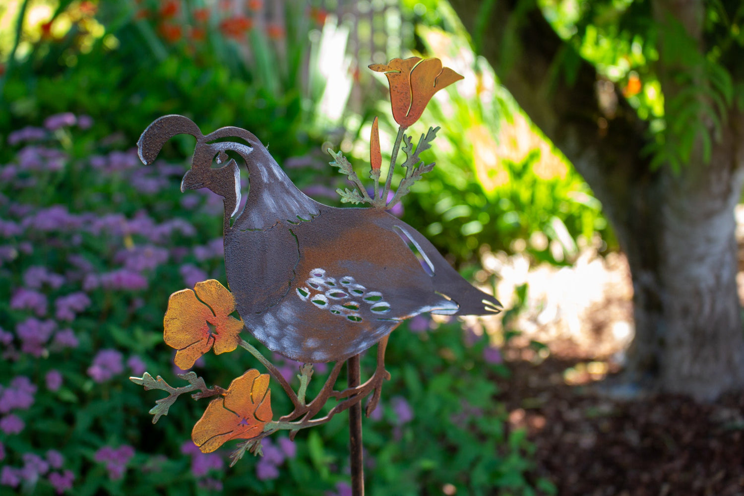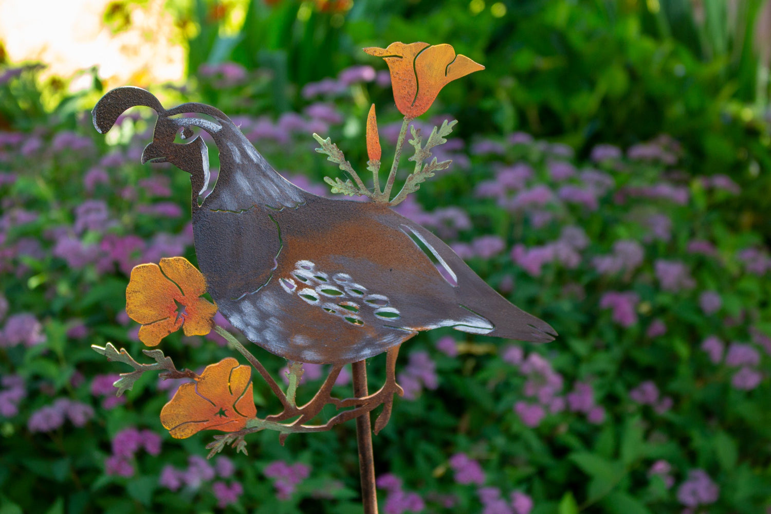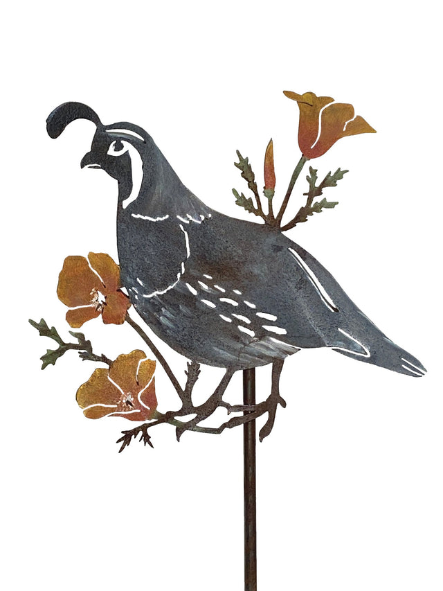 The Quail on Poppies Stake features the state bird and state flower of California.
