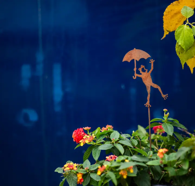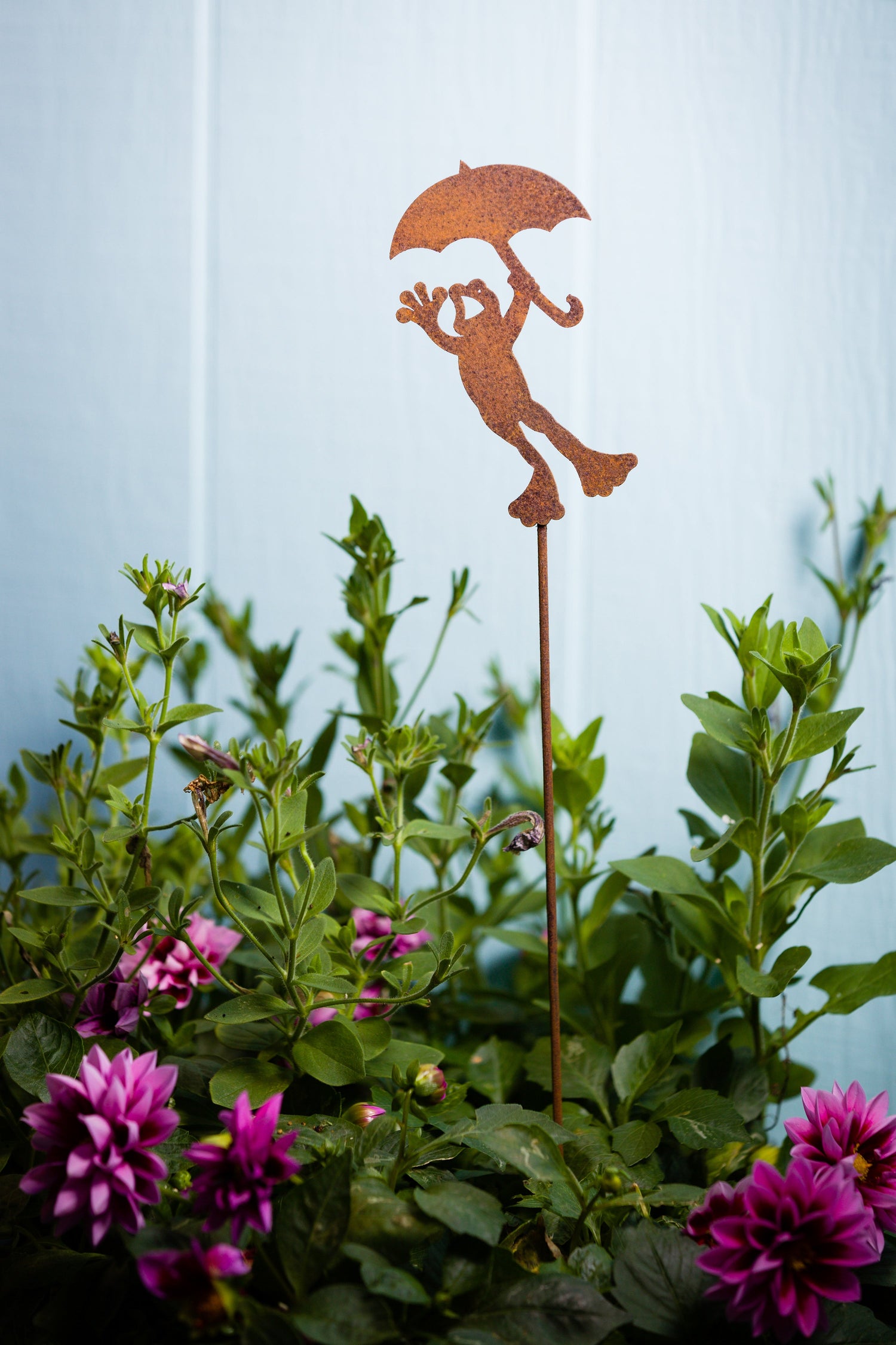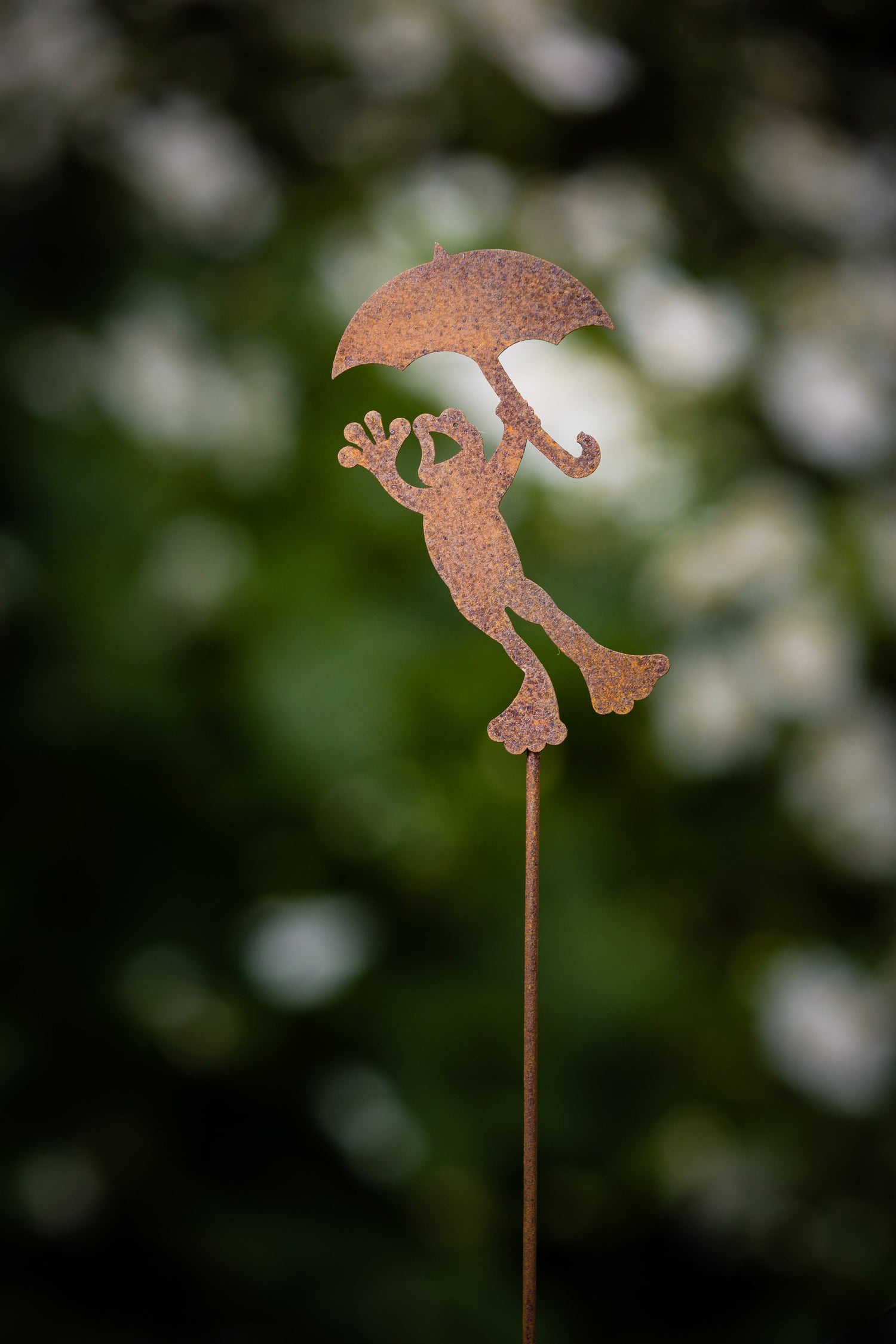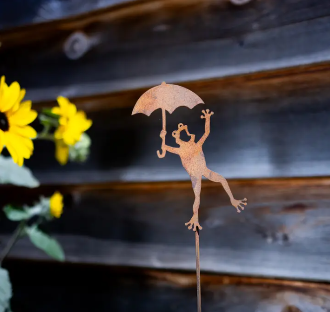 Our Frog with Umbrella Pick is a whimsical and cute addition to any flower bed or potted plant. It features a cartoon-style silhouette of a frog standing on two legs. It’s complete with an open mouth, and umbrella as if the frog is singing in the rain!