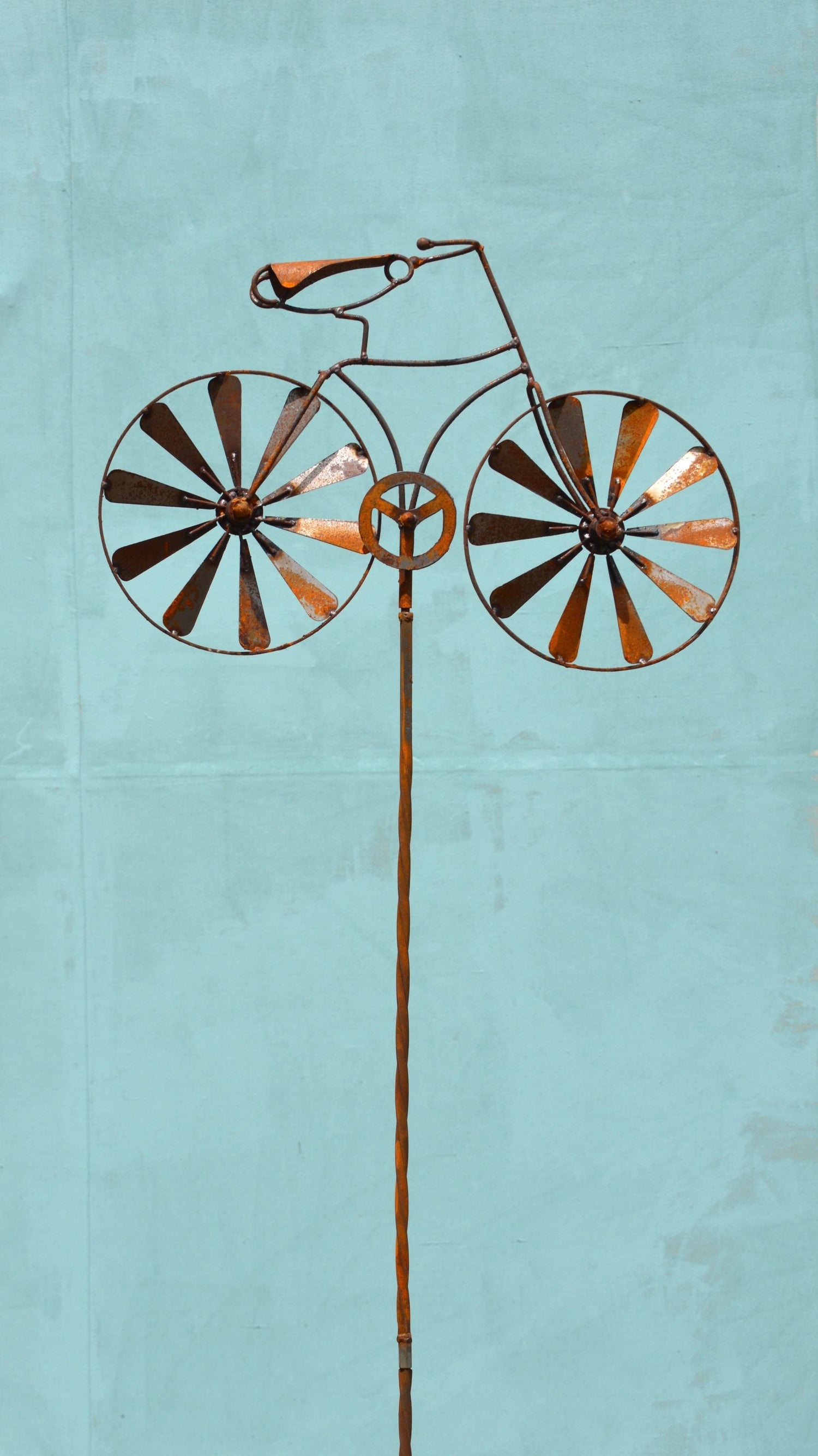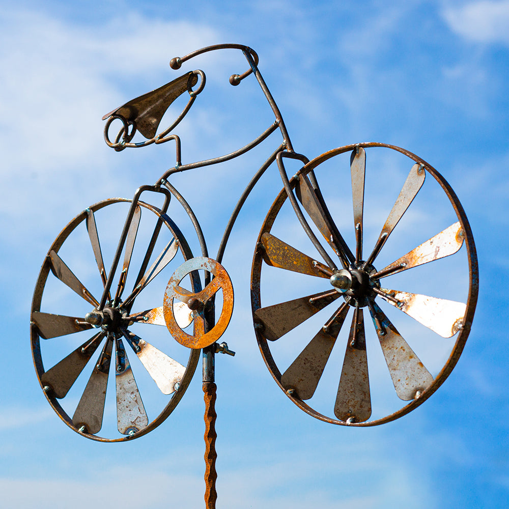 The Runaway Bicycle Spinner is a unique piece of metal garden art that adds a playful touch to any outdoor space. It features a rusty, weathered bicycle suspended in mid-air, seemingly caught in a moment of motion. The bicycle's wheels are cleverly designed to spin when the wind blows, creating a mesmerizing visual effect. The rusty appearance gives it a vintage and rustic charm, as if it has been left to age gracefully over time. This art piece not only adds visual interest to your garden, but also brings a sense of whimsy and nostalgia. It's a delightful conversation starter and a reminder of carefree childhood days spent riding bicycles. Whether you're a cycling enthusiast or simply appreciate unique garden decorations, the Runaway Bicycle Spinner is sure to capture attention and bring joy to your outdoor space.