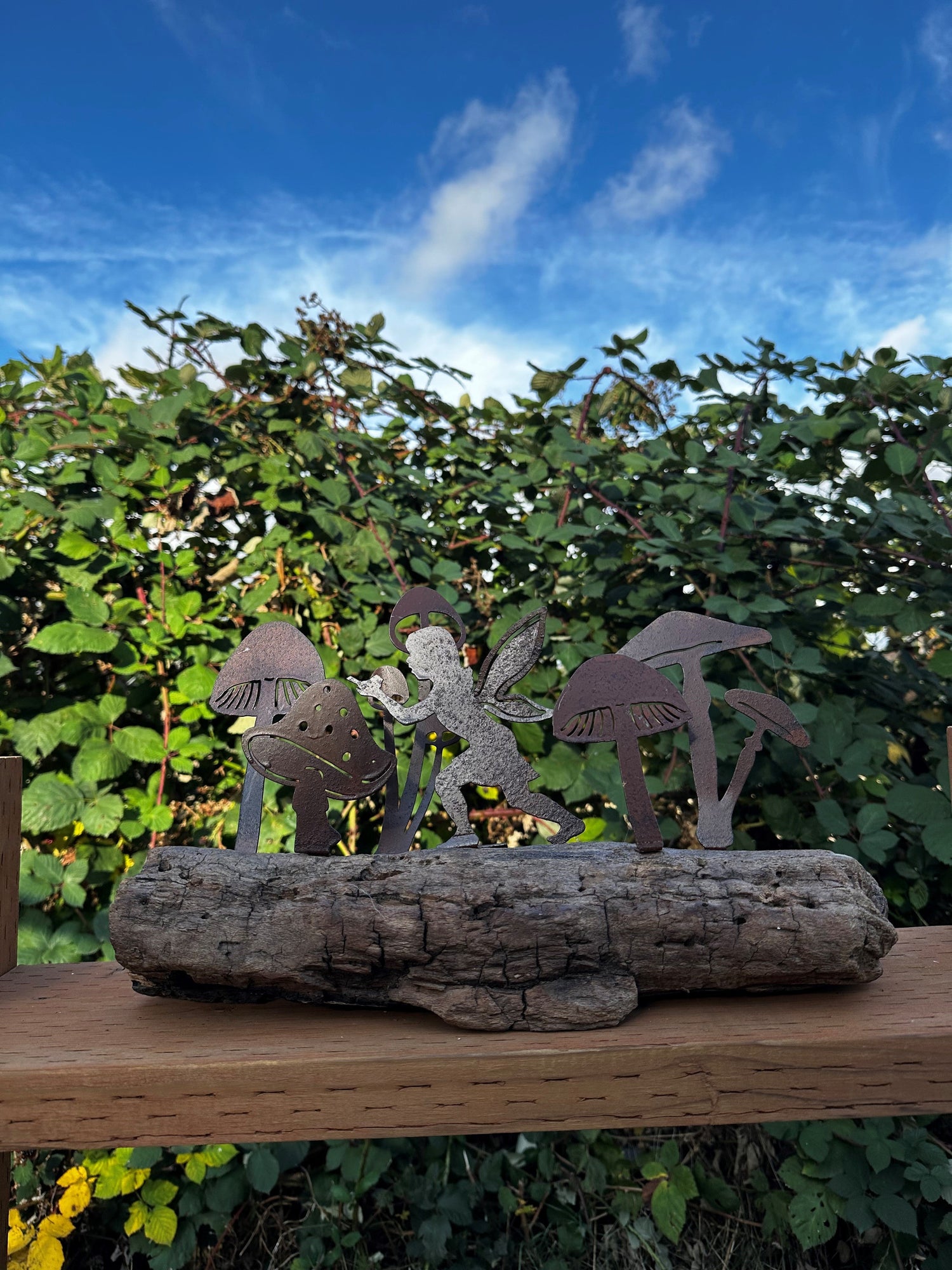 Transform your space with this enchanting metal artwork featuring whimsical mushrooms and a fairy friend, beautifully set on a piece of driftwood. The intricate metal design captures the wonderful essence of a fairy tale forest, with mushrooms and a playful fairy sneaking through the forage. The driftwood base adds a rustic charm, grounding the piece in nature and making it a perfect focal point for any room. Ideal for those who love a touch of fantasy and the beauty of the outdoors.