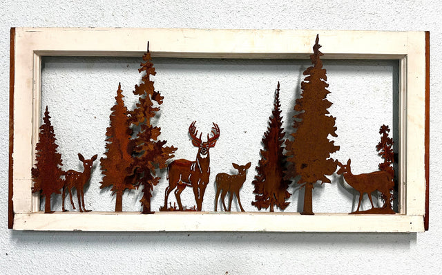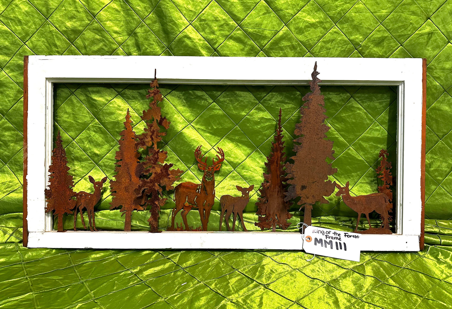 Transform your home into an enchanting woodland with the King of The Forest Frame. This beautiful metal artwork features a graceful deer family, handcrafted by owner of Rusty Birds, Jay Crowdus. The unique white window frame adds a touch of rustic charm to any room.