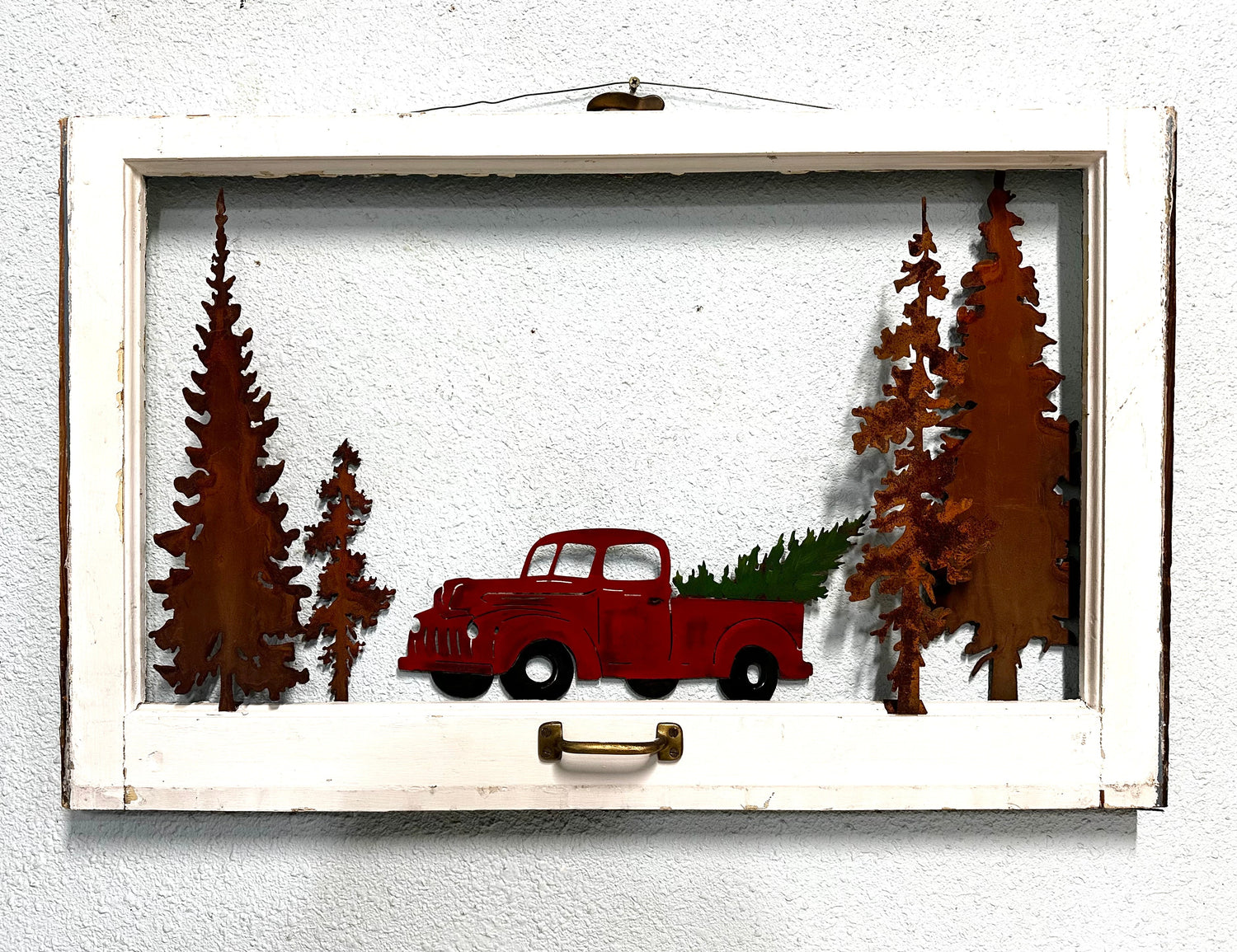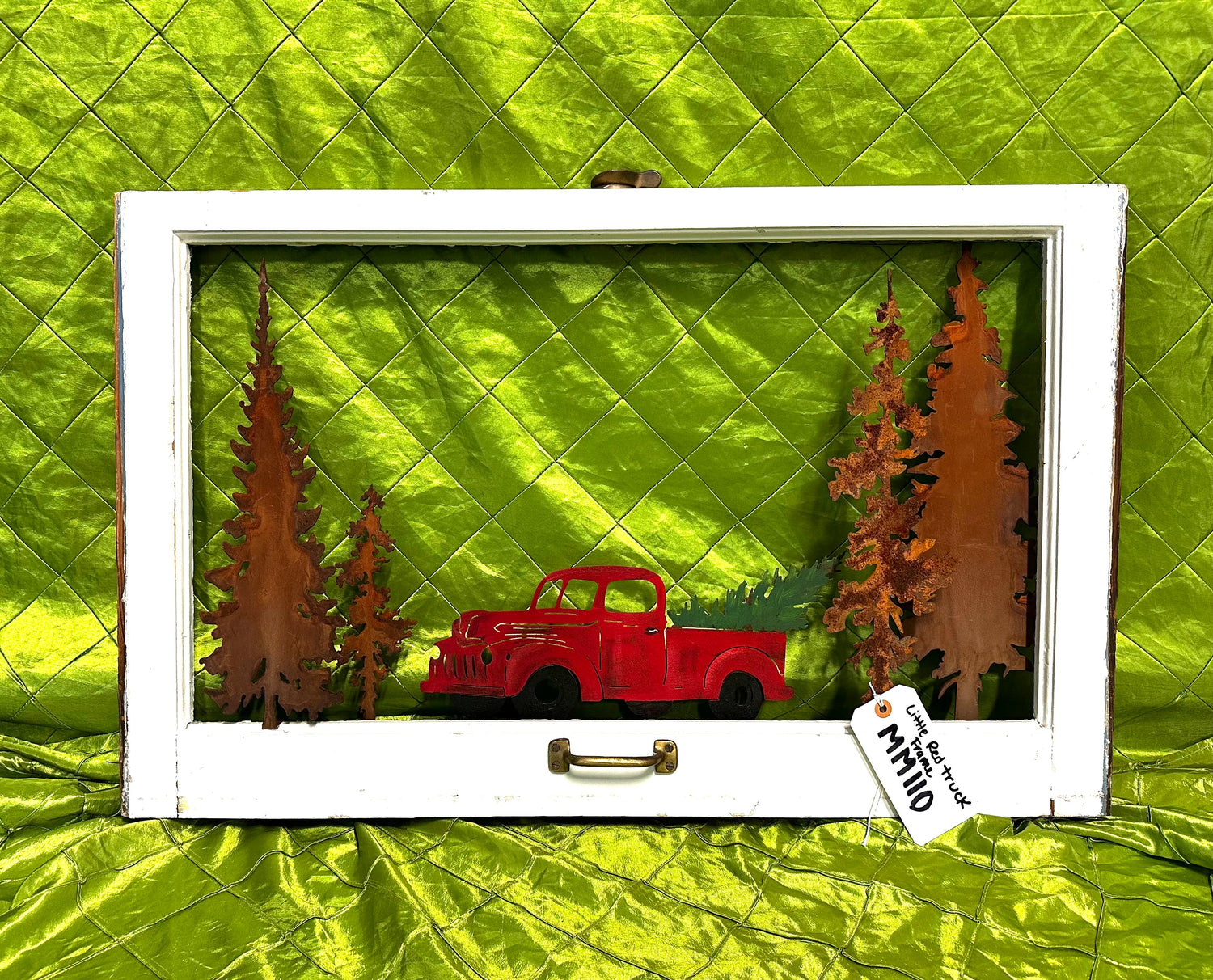 Hand crafted by local artist/owner of Rusty Birds- Jay Crowdus, this Little Red Truck Frame features a charming forest scene. Made with care and attention to detail, it adds a touch of whimsy to any home decor. Bring a piece of beautiful craftsmanship into your home with this unique frame.