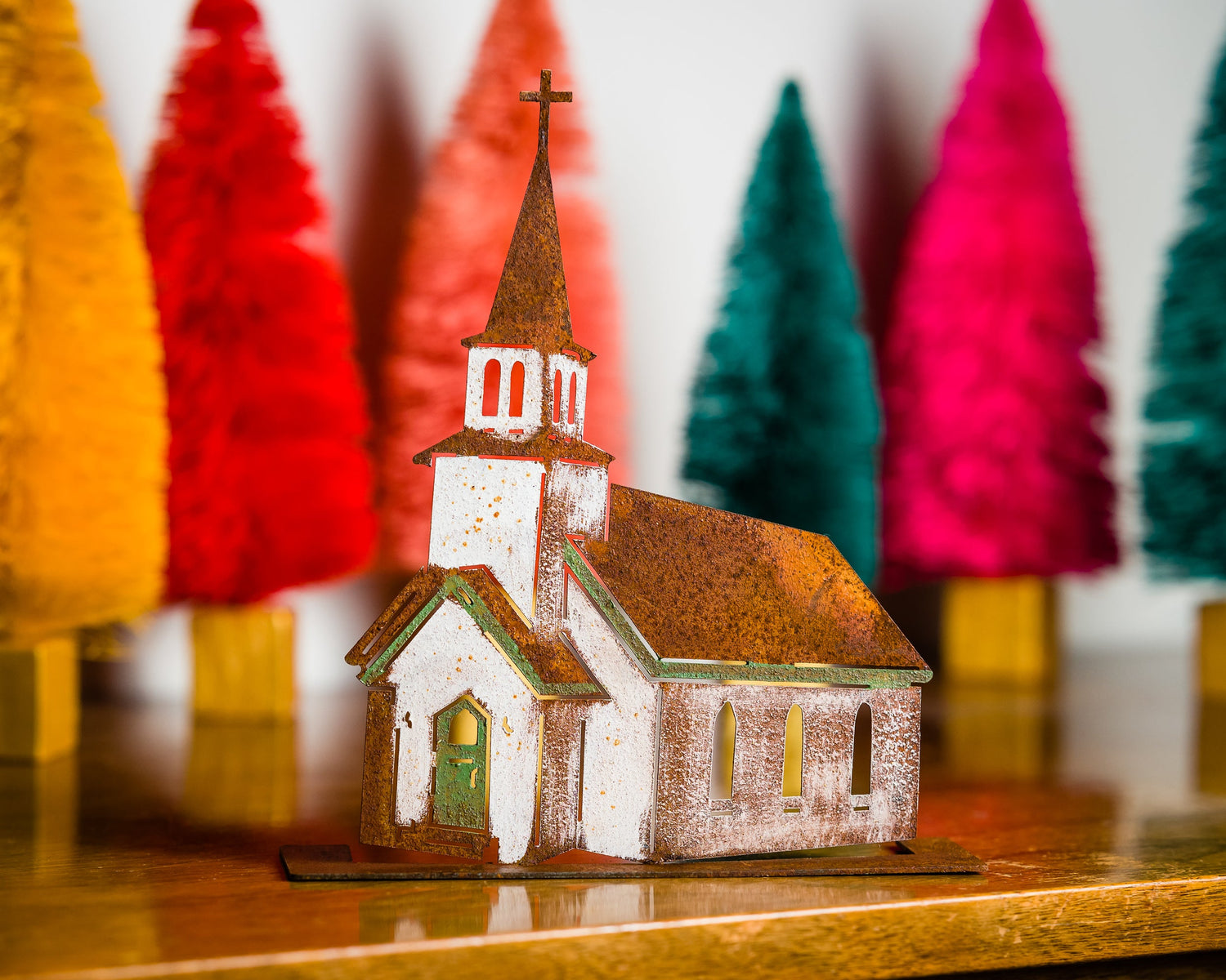 This classic, small-town, holiday church design is perfect as a stand-alone piece or as part of a holiday display. The Church Pop-Up is hand-painted by our artists after receiving our signature rusted treatment to bring the holiday spirit into any home.