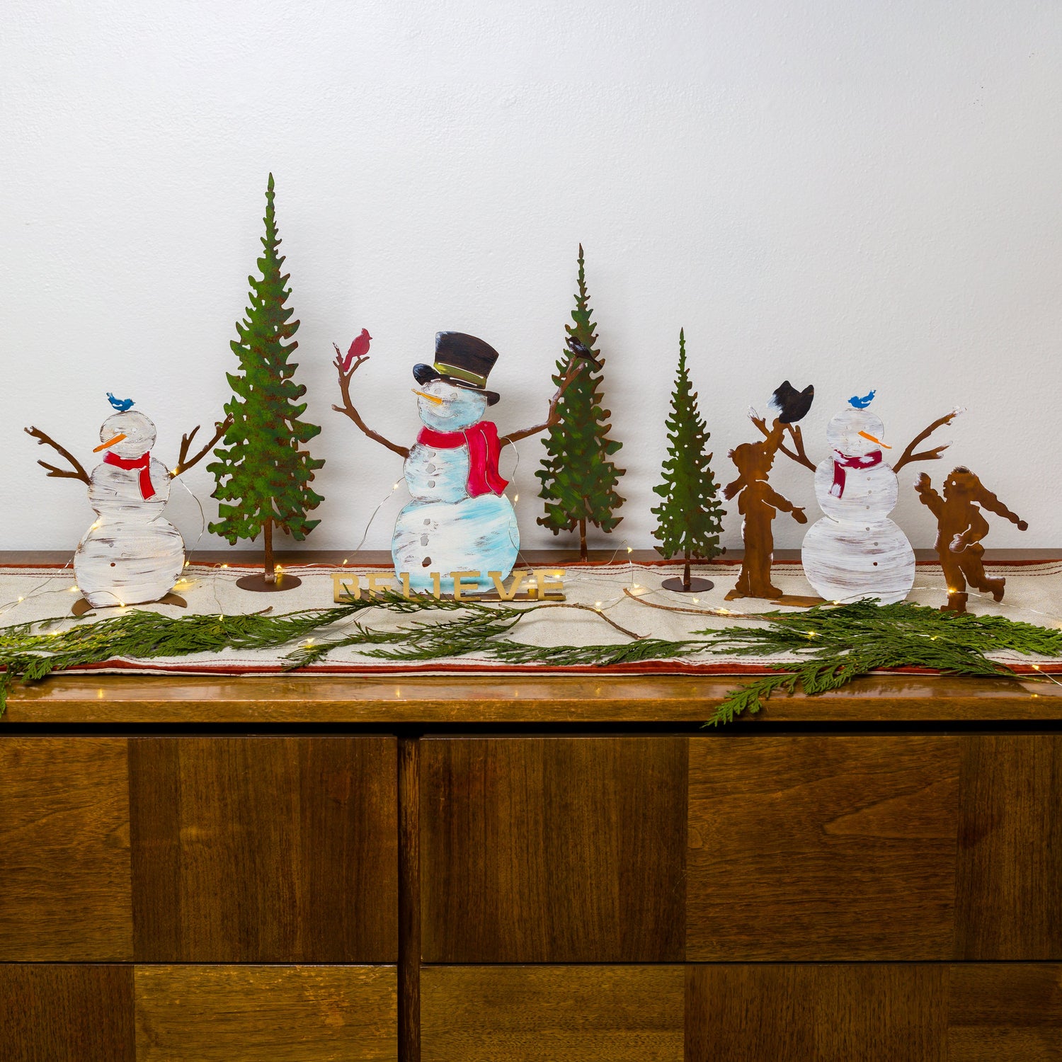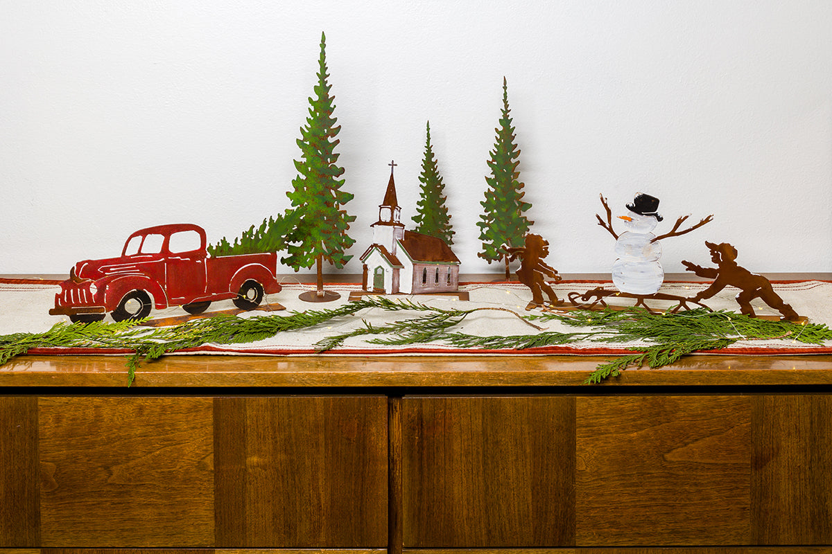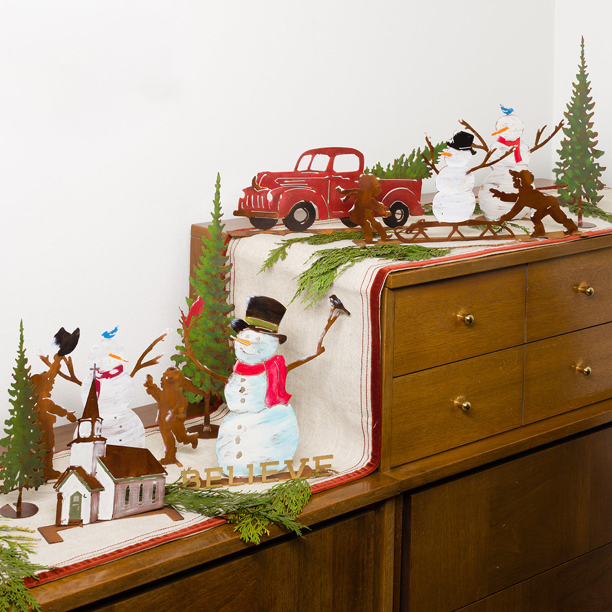 The Spruce Tree is made of recycled steel and hand-painted by our artists and clear-coated to preserve the colors. For an authentic, nature-inspired look, mount the metal spruce trees onto window frames or driftwood and display them as a table centerpiece, indoors or outdoors. These metal silhouettes are perfect to add to a mountain cabin or lodge decor!