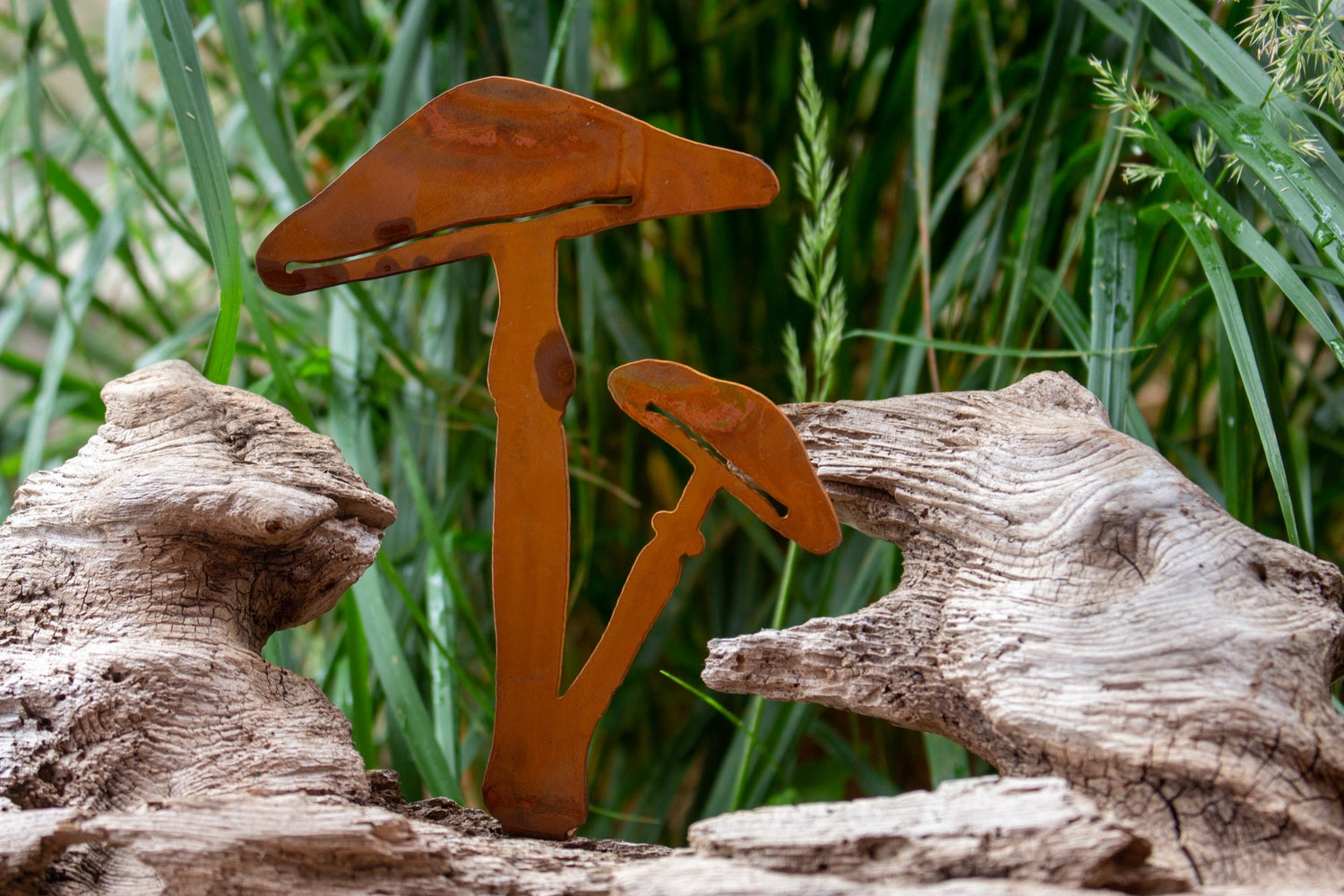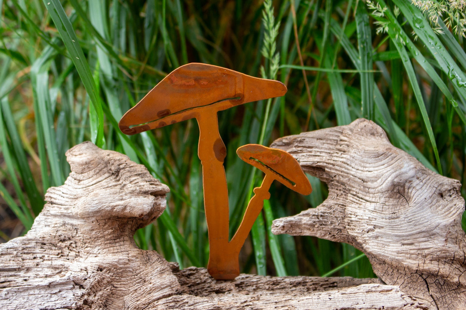 The Painted Sticky Cap Mushroom Tab is a delightful piece of metal garden yard art. This whimsical mushroom features a vibrant and eye-catching design. This metal silhouette is beautifully rusted, made to stand out against the green of a garden or houseplant. The sticky cap adds a touch of uniqueness, making it a standout piece among other decorations. With its durable construction, this charming mushroom is built to withstand outdoor elements and bring a touch of magic to your outdoor space.