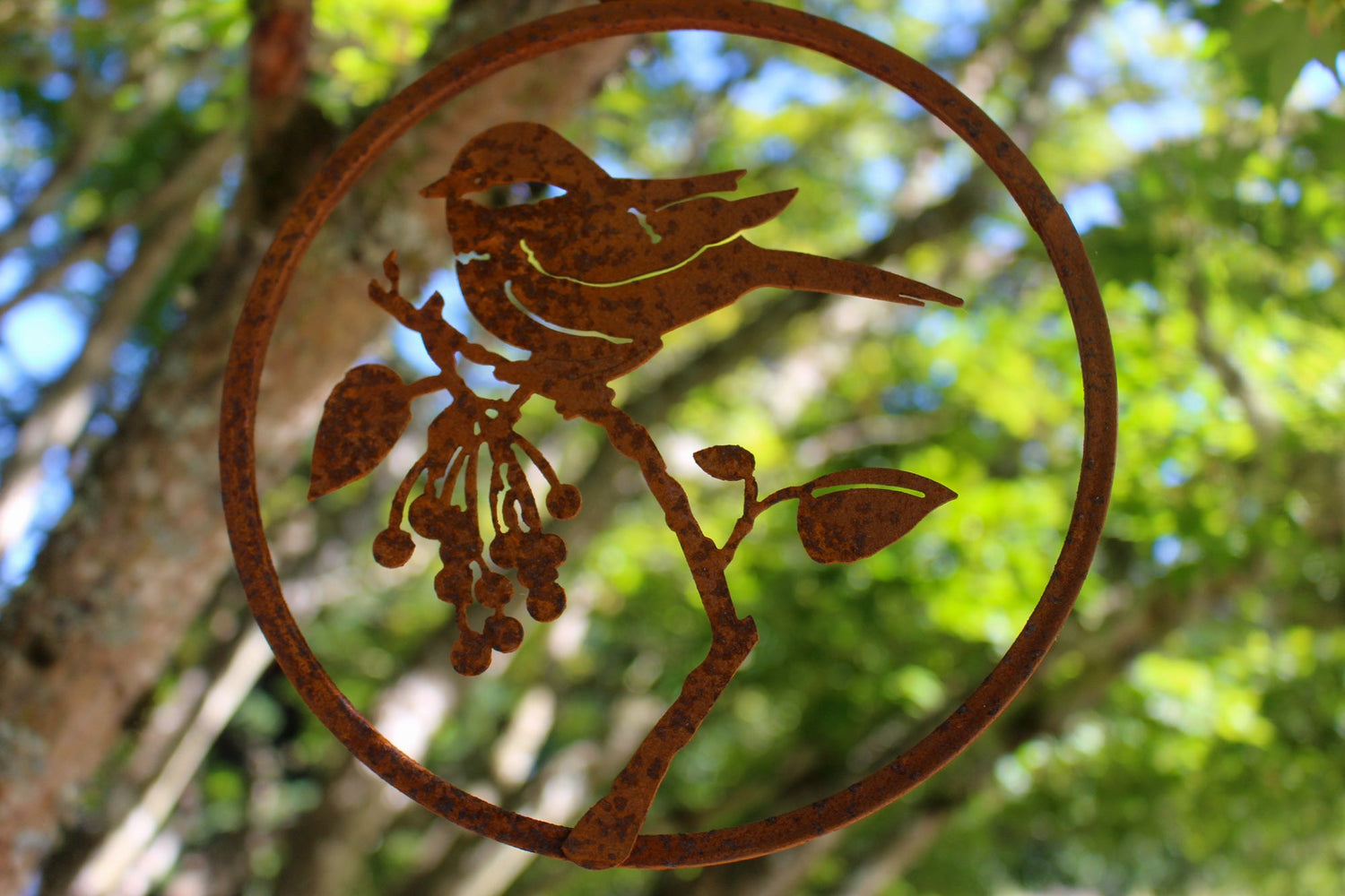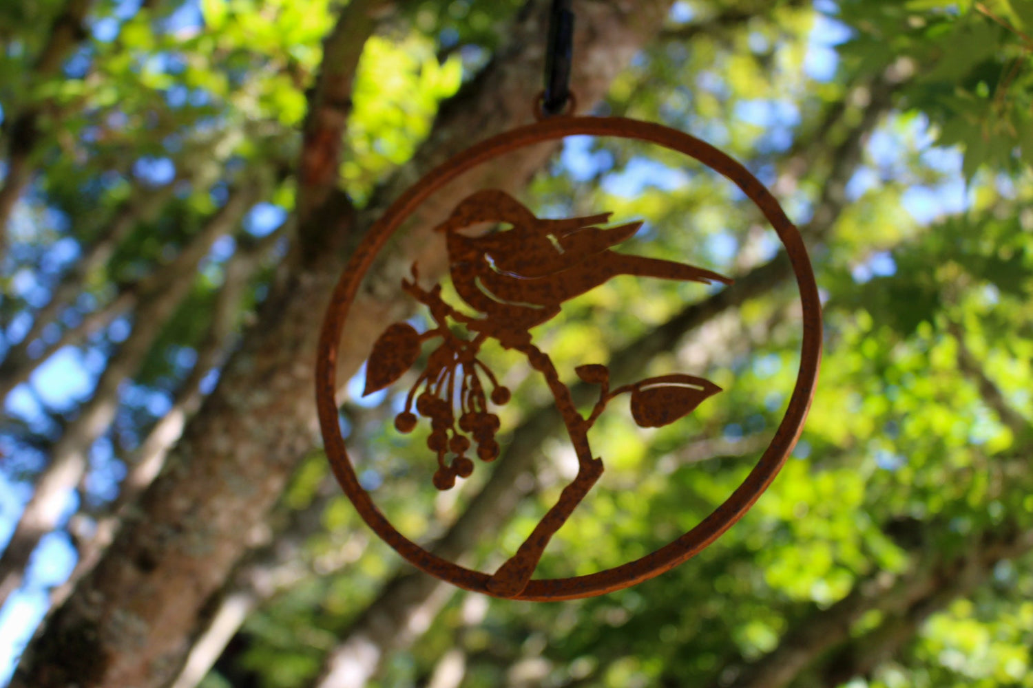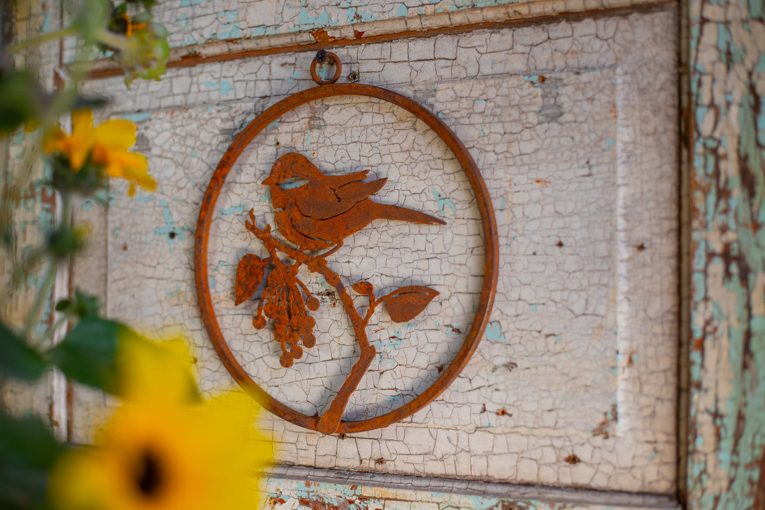 The Chickadee on Cherry Mini Ring is a delightful piece of rustic charm. With its rusty patina, it exudes a vintage appeal that adds character to any space. The mini ring features a charming depiction of a chickadee, meticulously handcrafted and perched on a branch, bringing a touch of nature indoors. Measuring approximately 6" in diameter, this compact yet eye-catching piece is perfect for smaller spaces or as an accent to a larger collection. The Chickadee on Cherry Mini Ring is a unique and charming addition to any rustic or nature-inspired decor.