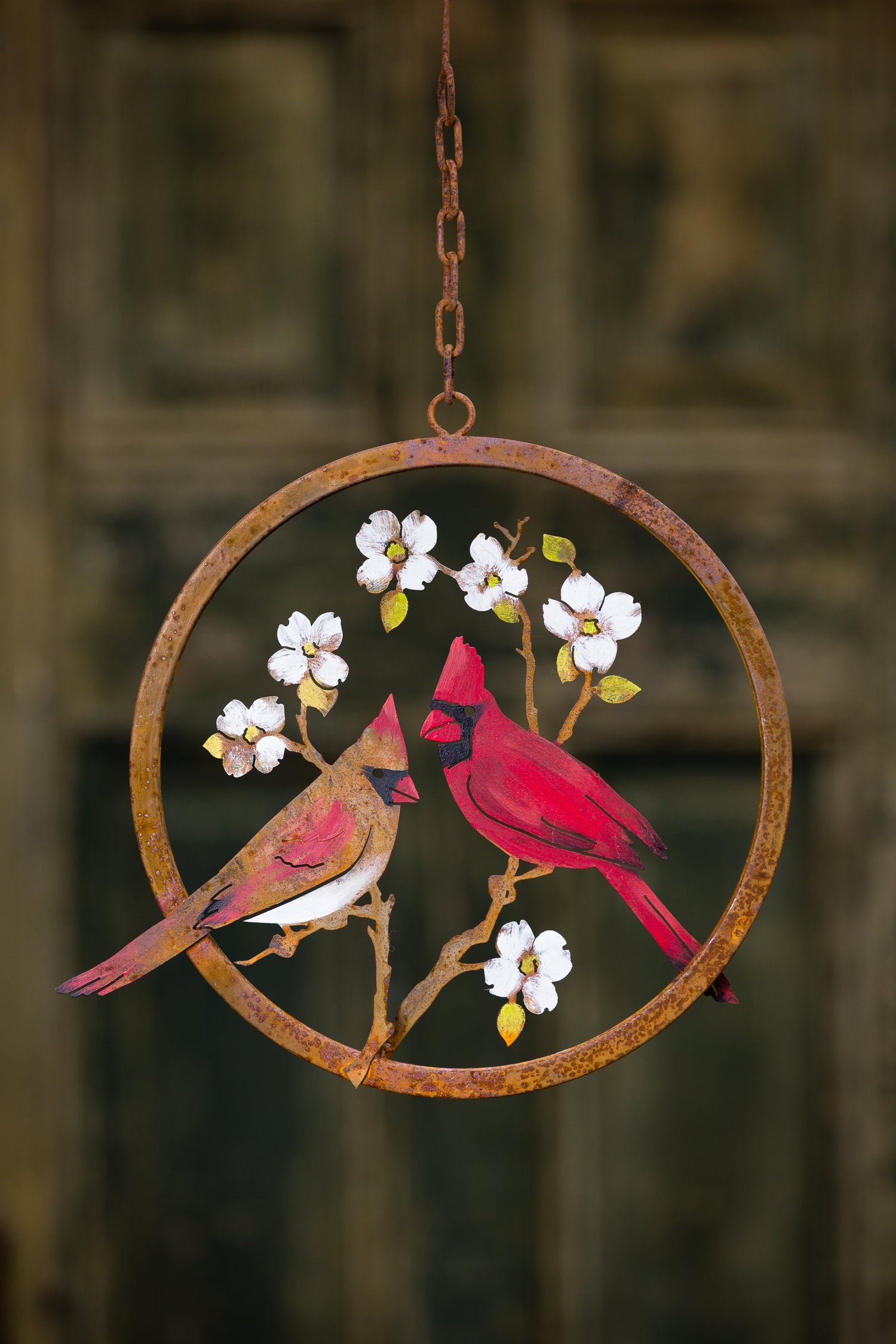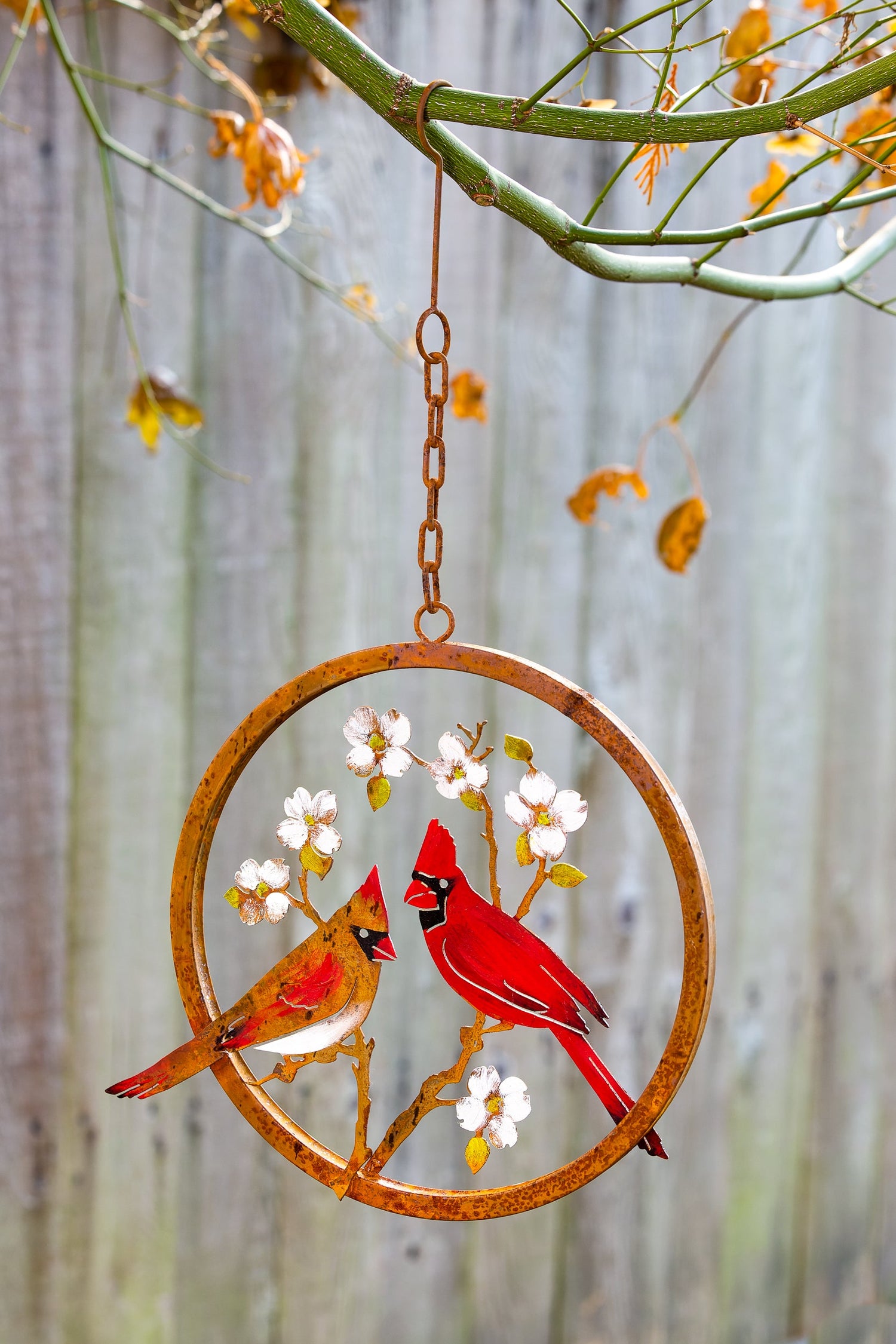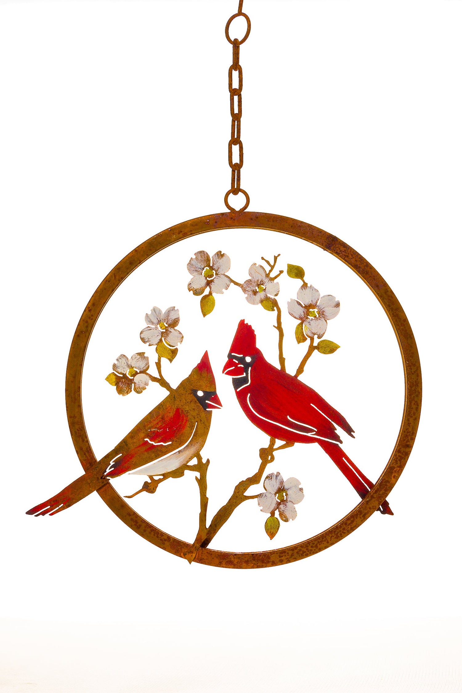The Cardinals on Dogwood Ring is a beautifully curated piece of metal garden art designed with nature in mind. It is hand-painted by our artists to accentuate the iconic bright red color of the cardinal and the beautiful pastel yellow and white hues of a dogwood bloom in springtime.