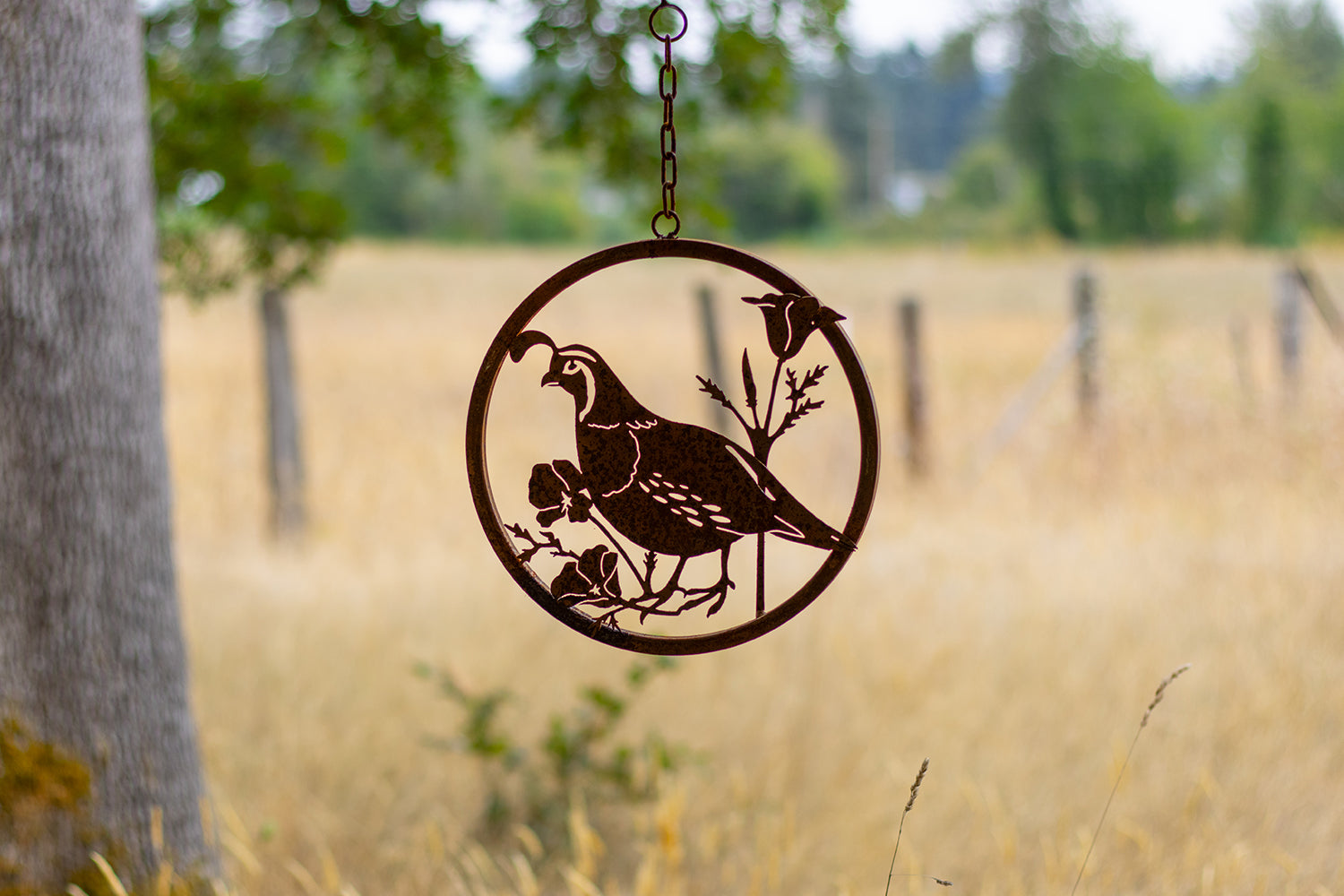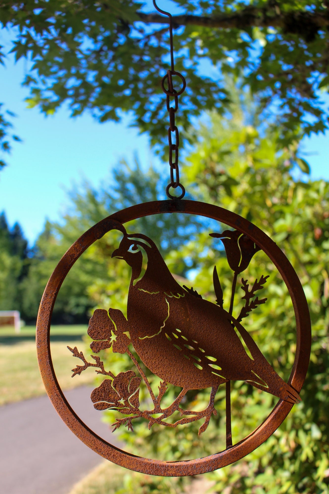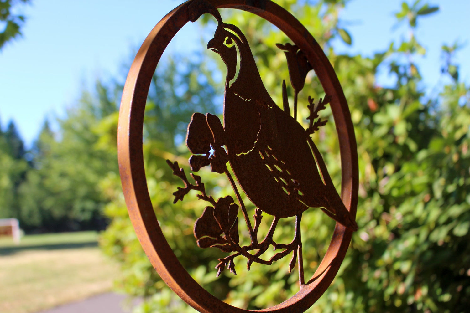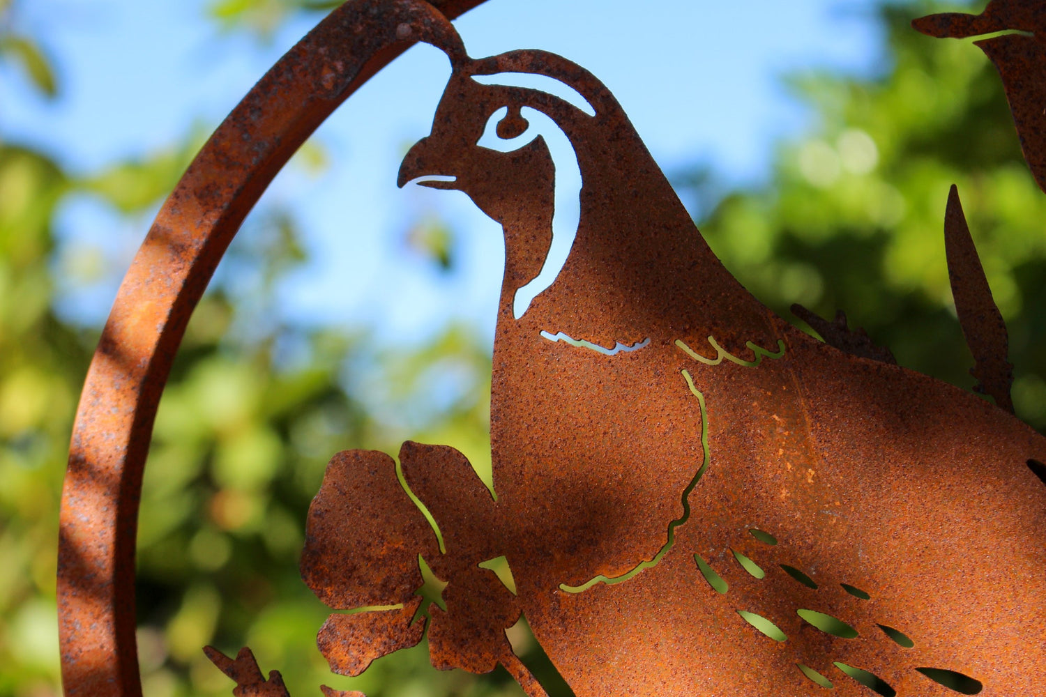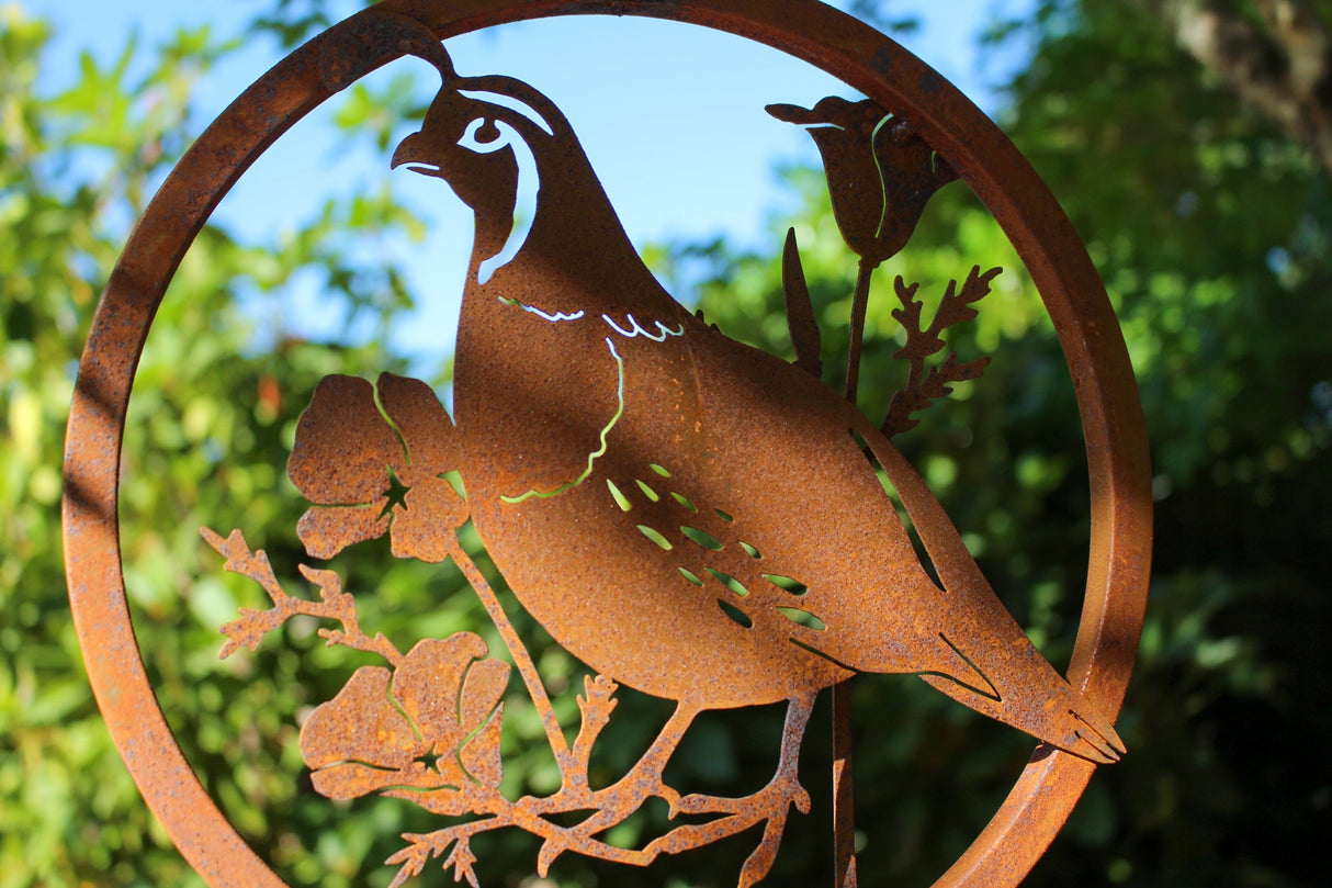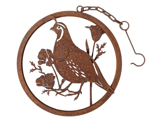 This quirky garden ring features a rusted quail adorned with charming poppy flowers. Bring a touch of whimsy to your outdoor space with this one-of-a-kind piece. No green thumb required!