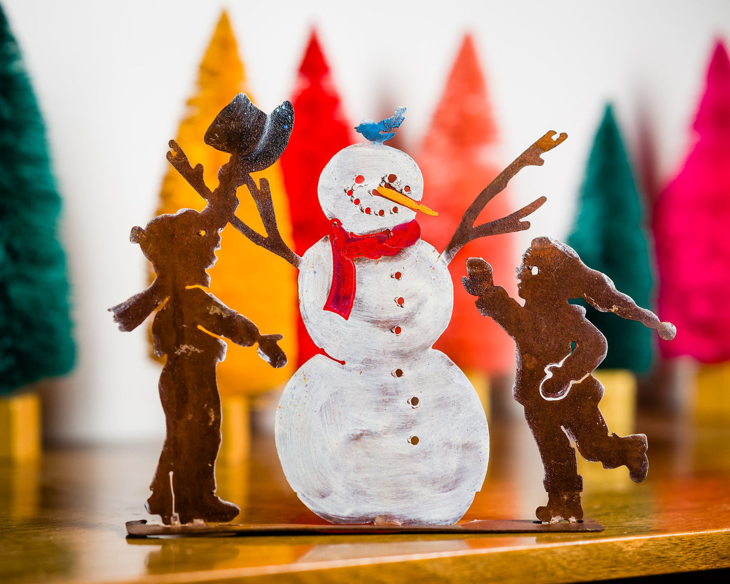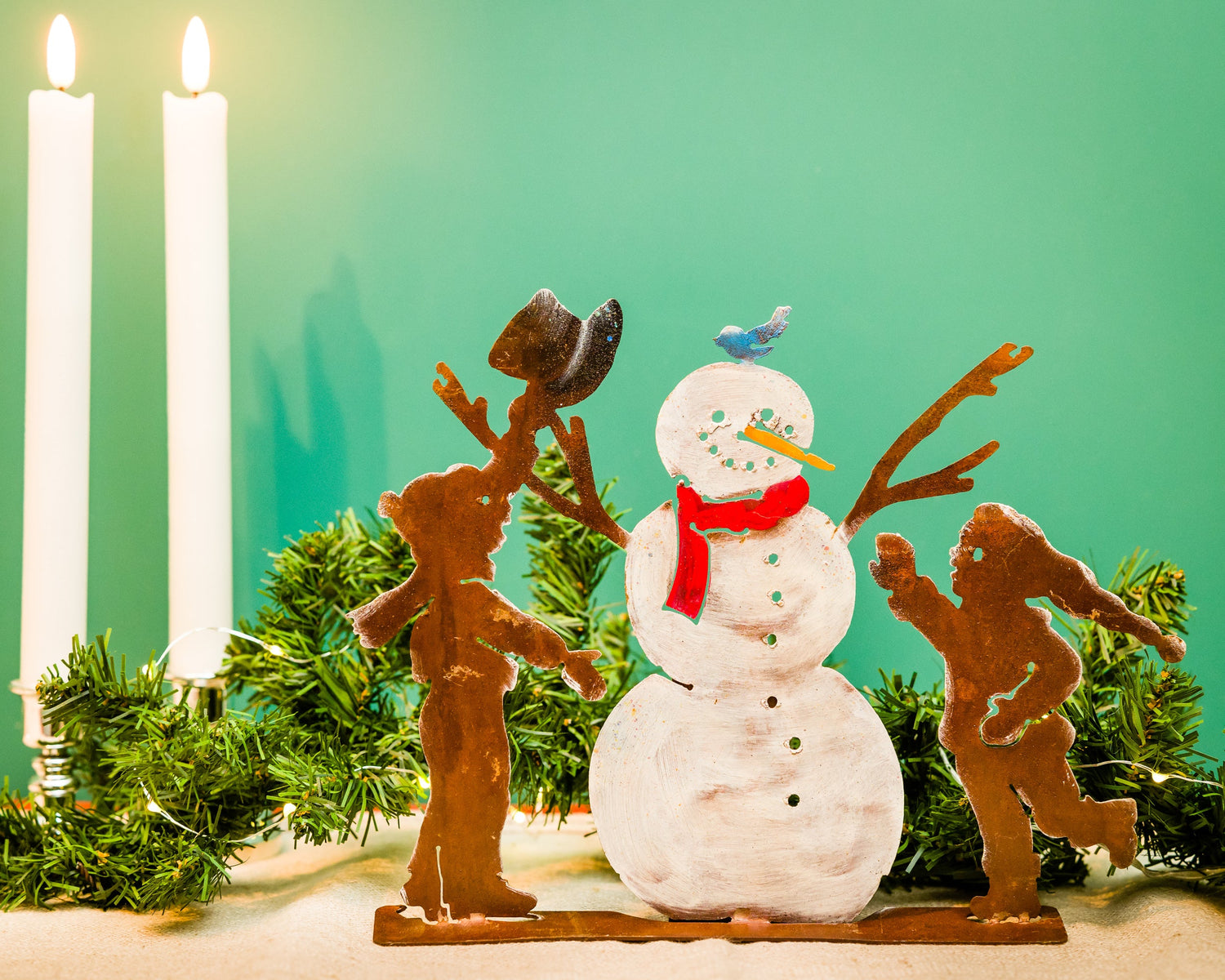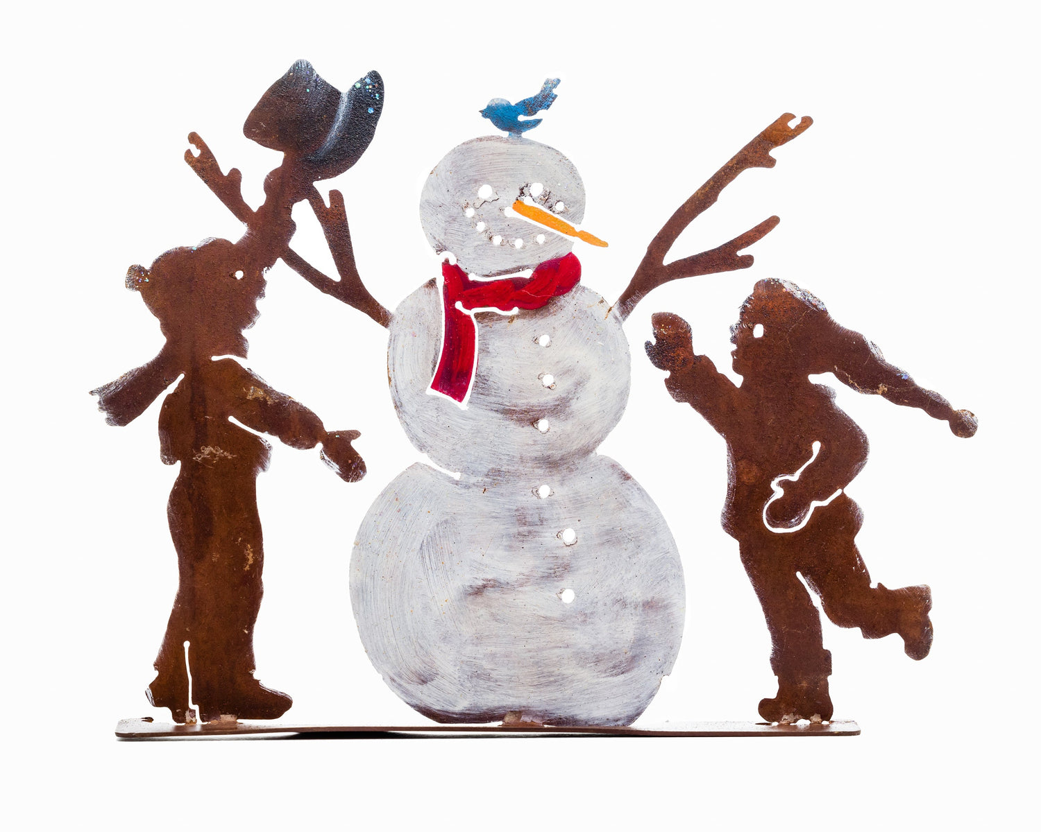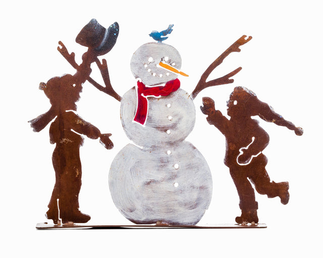 The Snowman and Kids Tab is made of recycled steel and pre-treated to create our signature rusted texture and natural look. It's then hand-painted by our artists to make it a perfect holiday decoration.