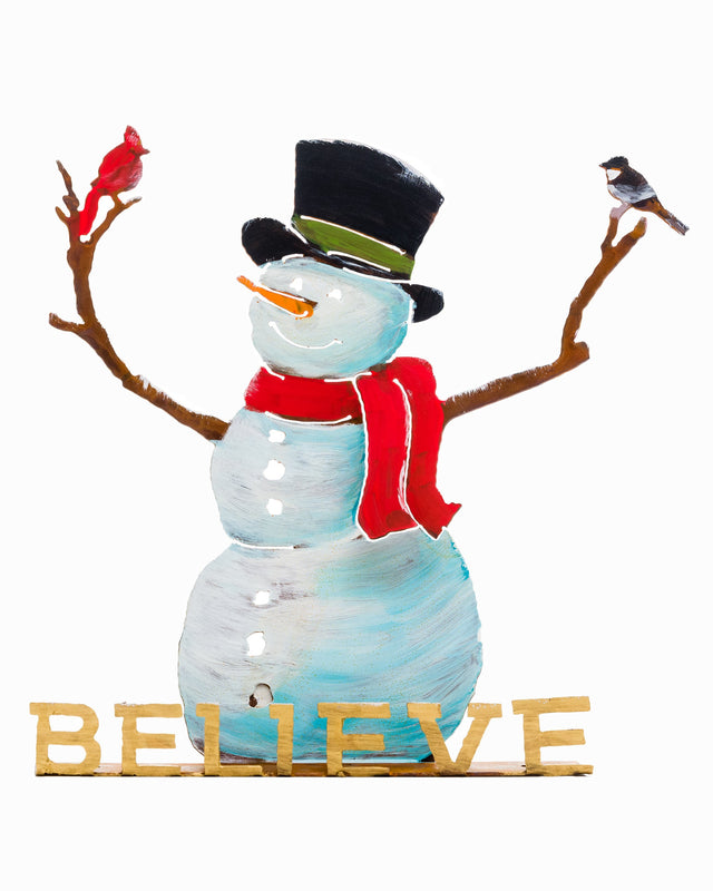 The Snowman Believe Tab is made of recycled steel and pre-treated to create our signature rusted texture and natural look. It's then hand-painted by our artists to make it a perfect holiday decoration.