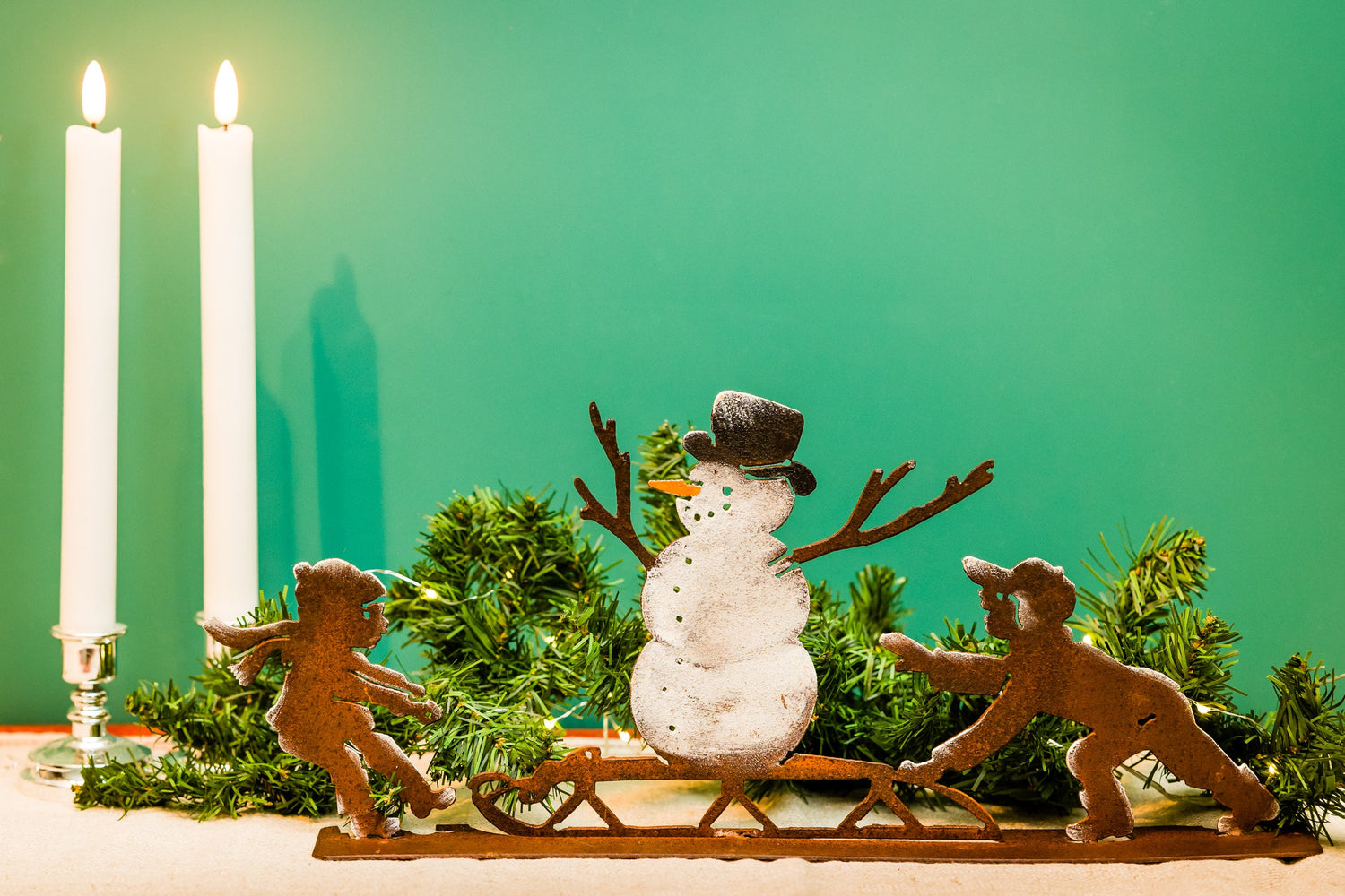 Our Snowman with Kids and Sleigh is a holiday classic featuring a boy and girl pulling their snowman on a sleigh. This beautiful, hand-painted piece is a perfect addition to any holiday collection.
