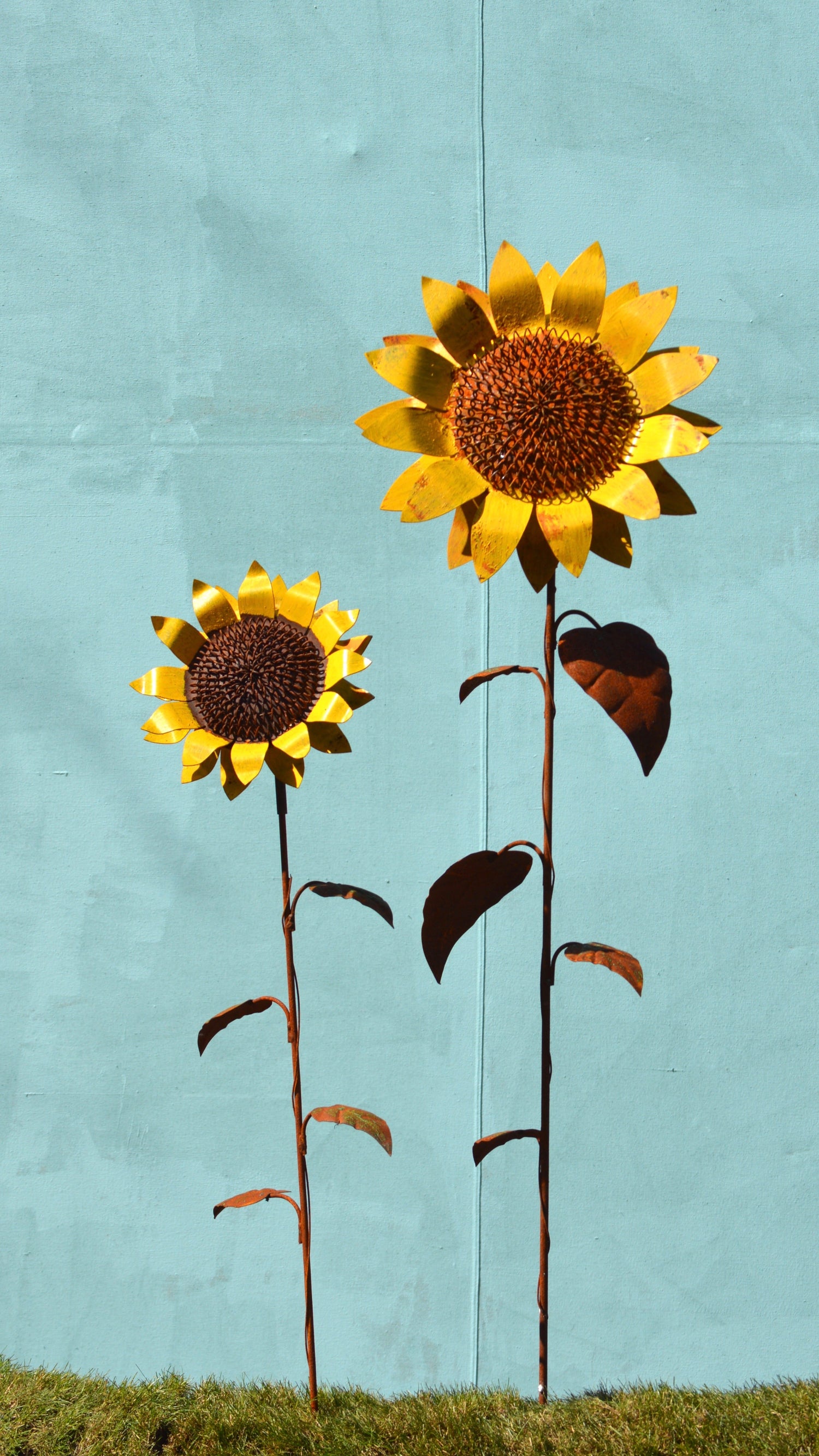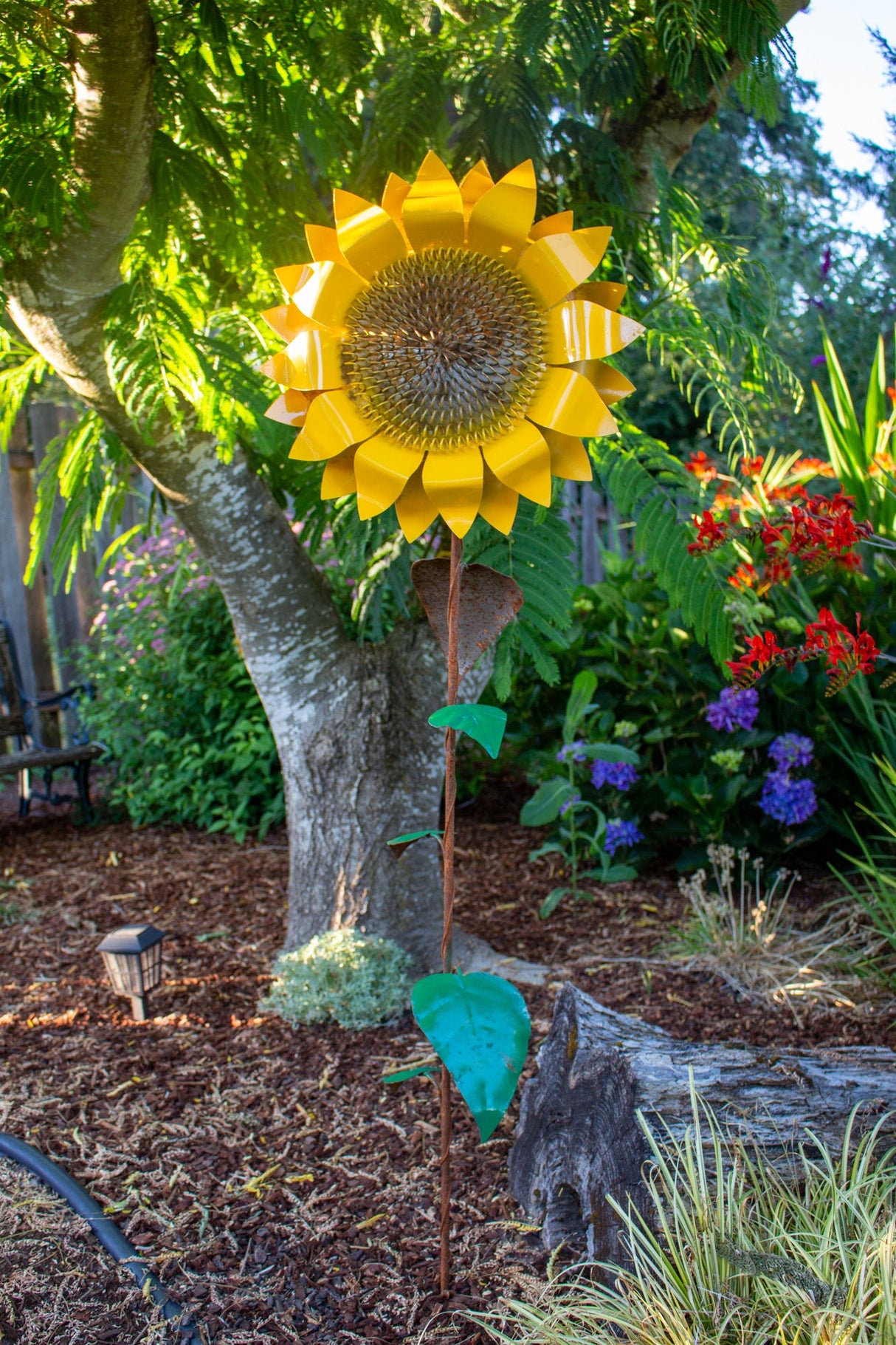 The Sunflower Stake Large is a metal garden art piece that will add a rustic touch to your outdoor space. Made from sturdy metal, it features a beautiful sunflower design that adds a vibrant and cheerful vibe to any garden. The metal has a rusty finish, giving it an antique and weathered look that adds character and charm. If the large size doesn't fit your space, you can find a smaller version elsewhere on the website. The Sunflower Stake Large measures 55 inches in height and 18 inches in width, making it a striking and eye-catching centerpiece for your garden. It's a perfect addition for bird lovers, as it attracts birds and adds a delightful element of nature to your surroundings.