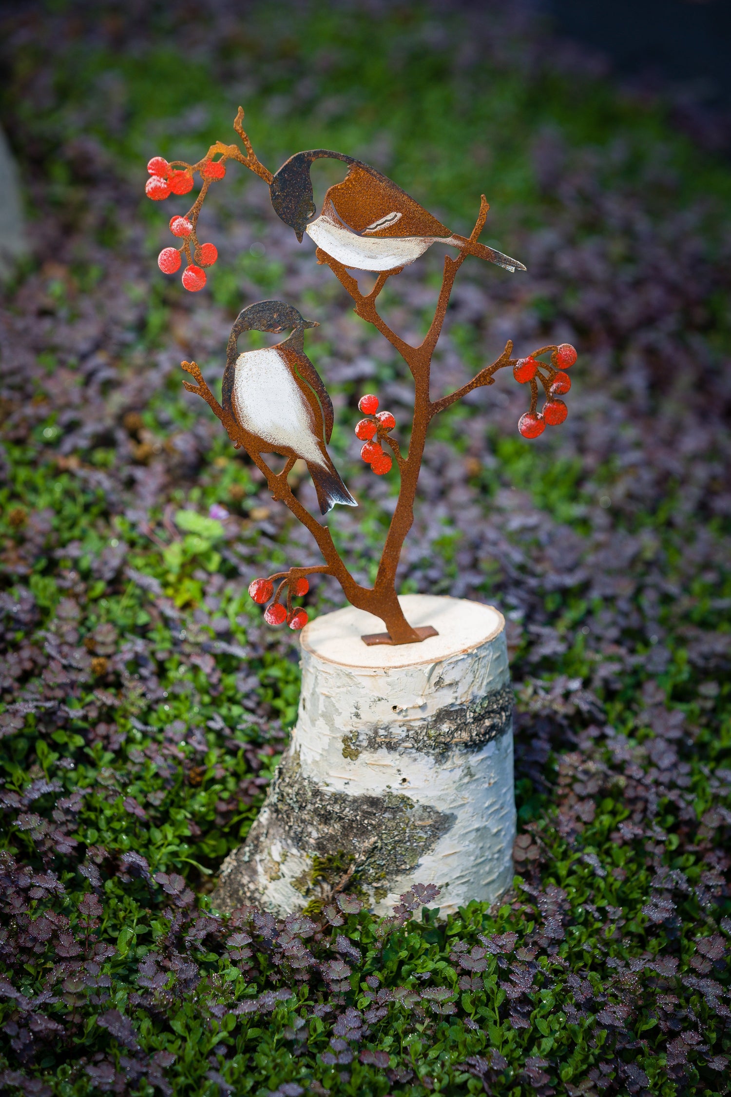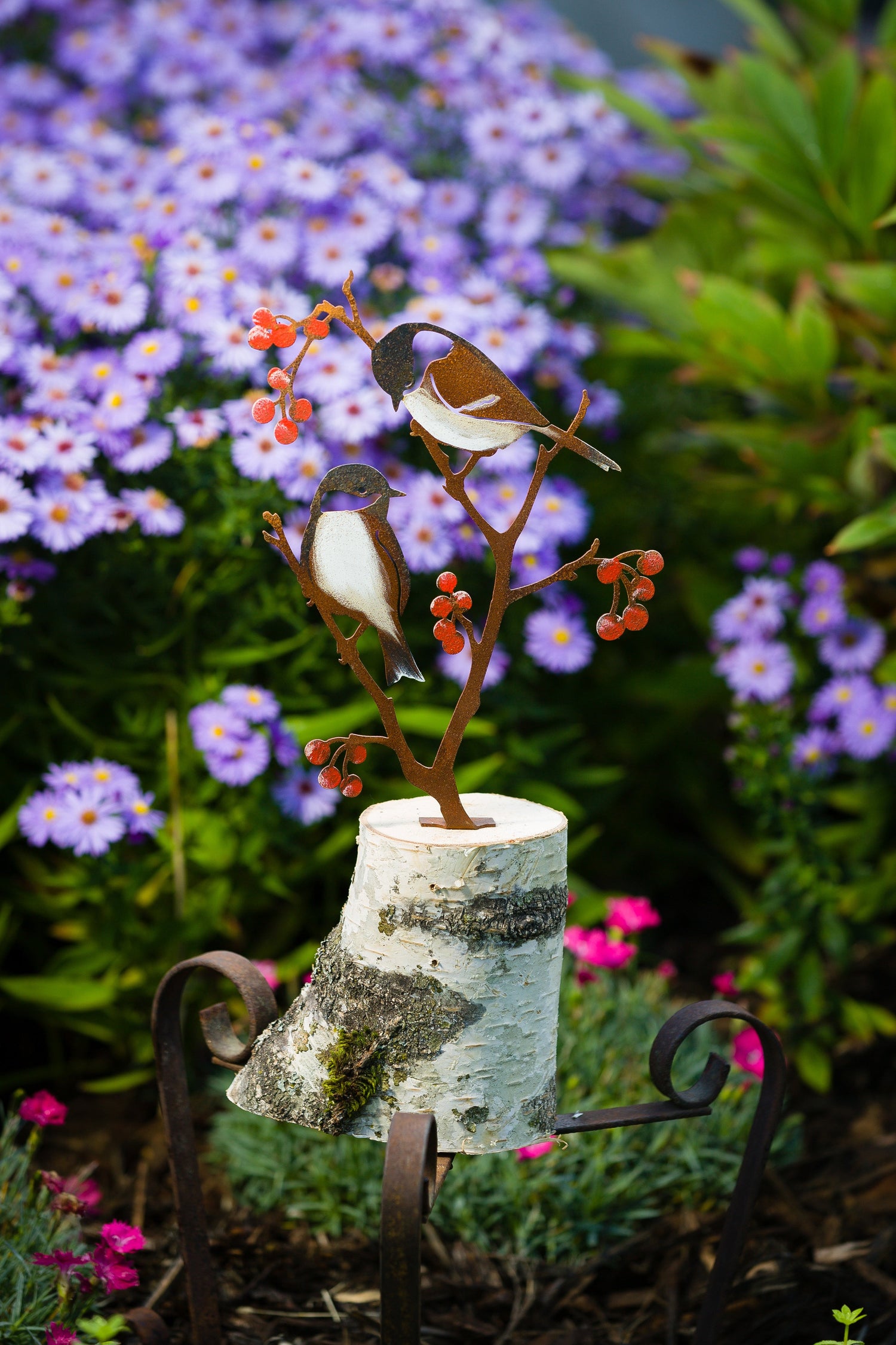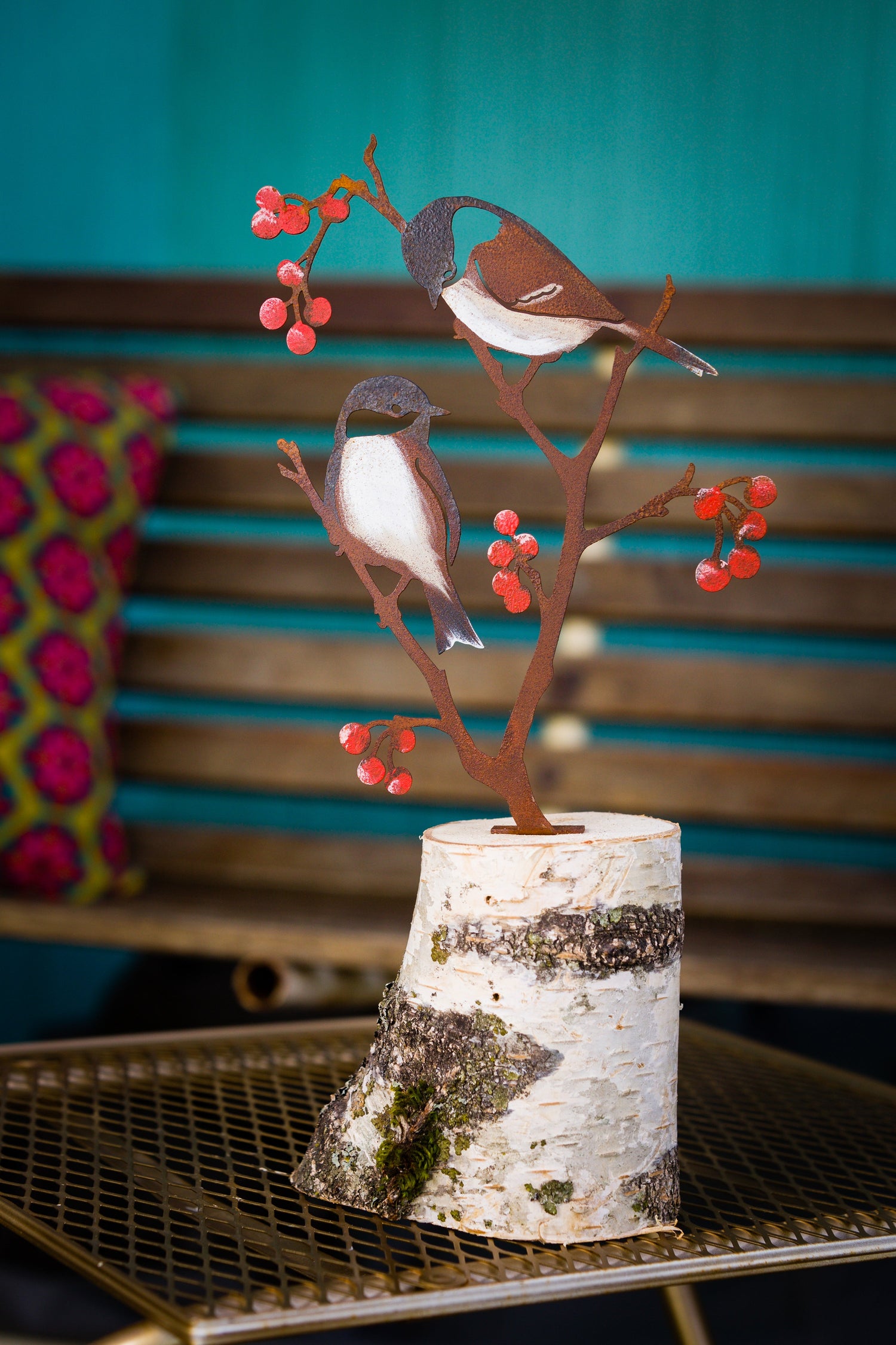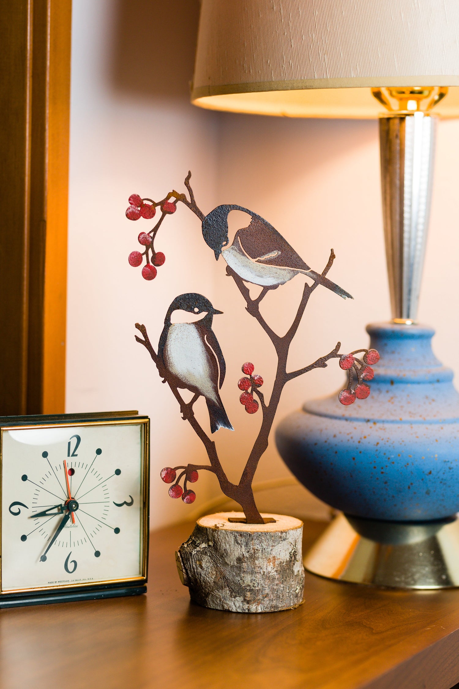 Chickadees are adorable and well-known birds named after their distinct “chick-a-dee” song. Although they typically reside among forest trees, you can bring the adorable songbird to your backyard with our beautiful Chickadees & Berries metal garden art!