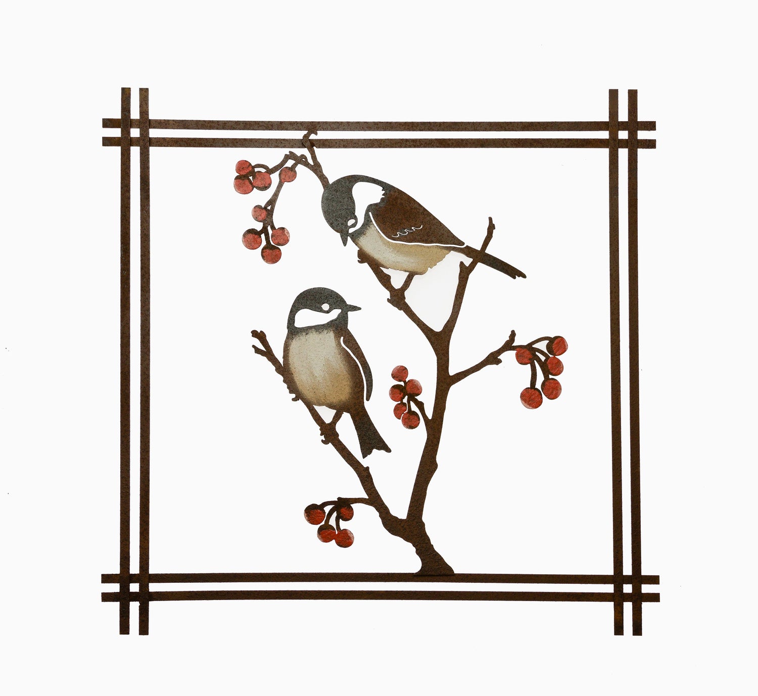 The Chickadees and Berries Wall Art is a unique design that features hand-painted details, accentuating the white bellies of the chickadee bird, as well as vibrant red berries that they love to enjoy as a snack. It is completed by a crafted rusty frame that features an interwoven design at the corners. This is one of our most popular pieces, especially during the holidays.