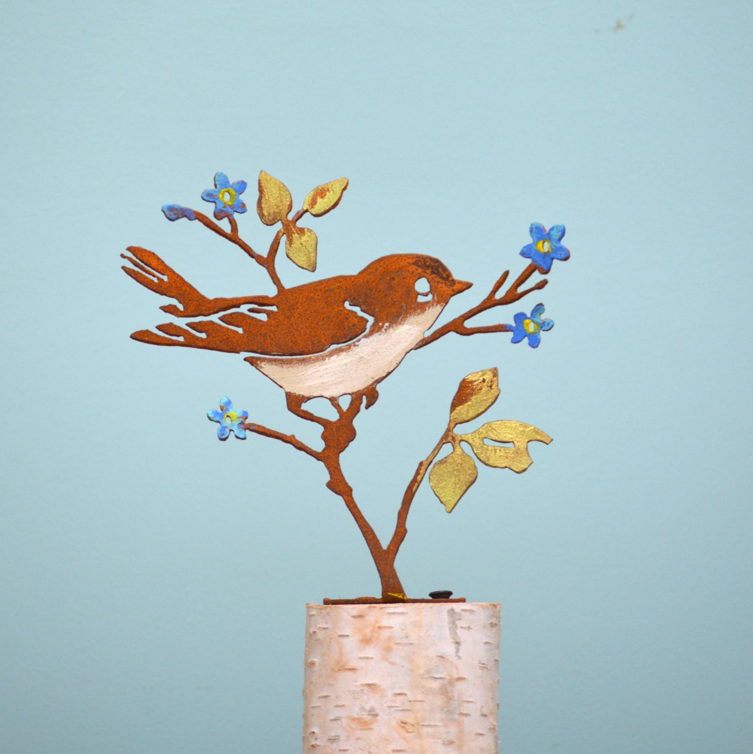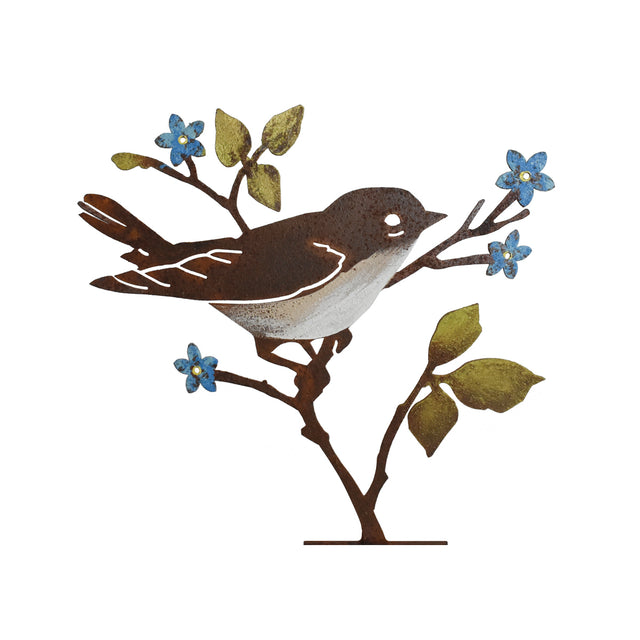 The Upright Warbler with Flower is made of recycled steel and pre-treated to create our signature rusted texture and natural look. It also features hand-painted details which highlight the iconic bright blue color of the forget-me-not flower, as well as shading on the leaves and the warbler’s chest.