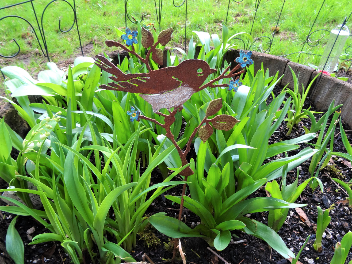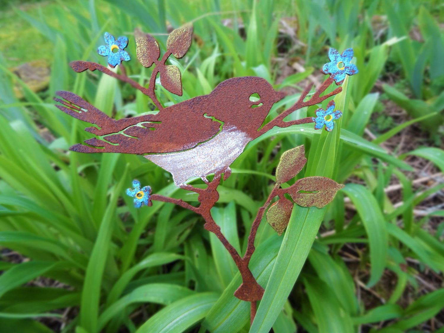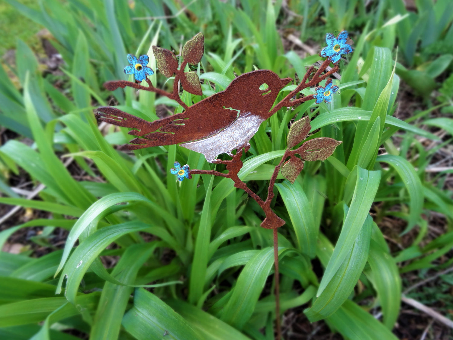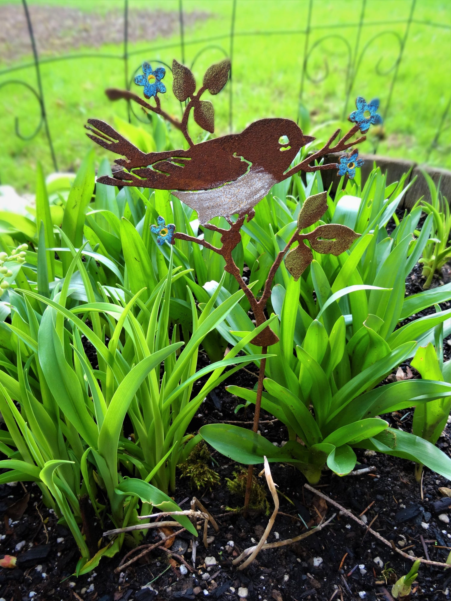 The Warbler with Flower Stake is made of recycled steel and pre-treated to create our signature rusted texture and natural look. It also features hand-painted details which highlight the iconic bright blue color of the forget-me-not flower, as well as shading on the leaves and the warbler’s chest.