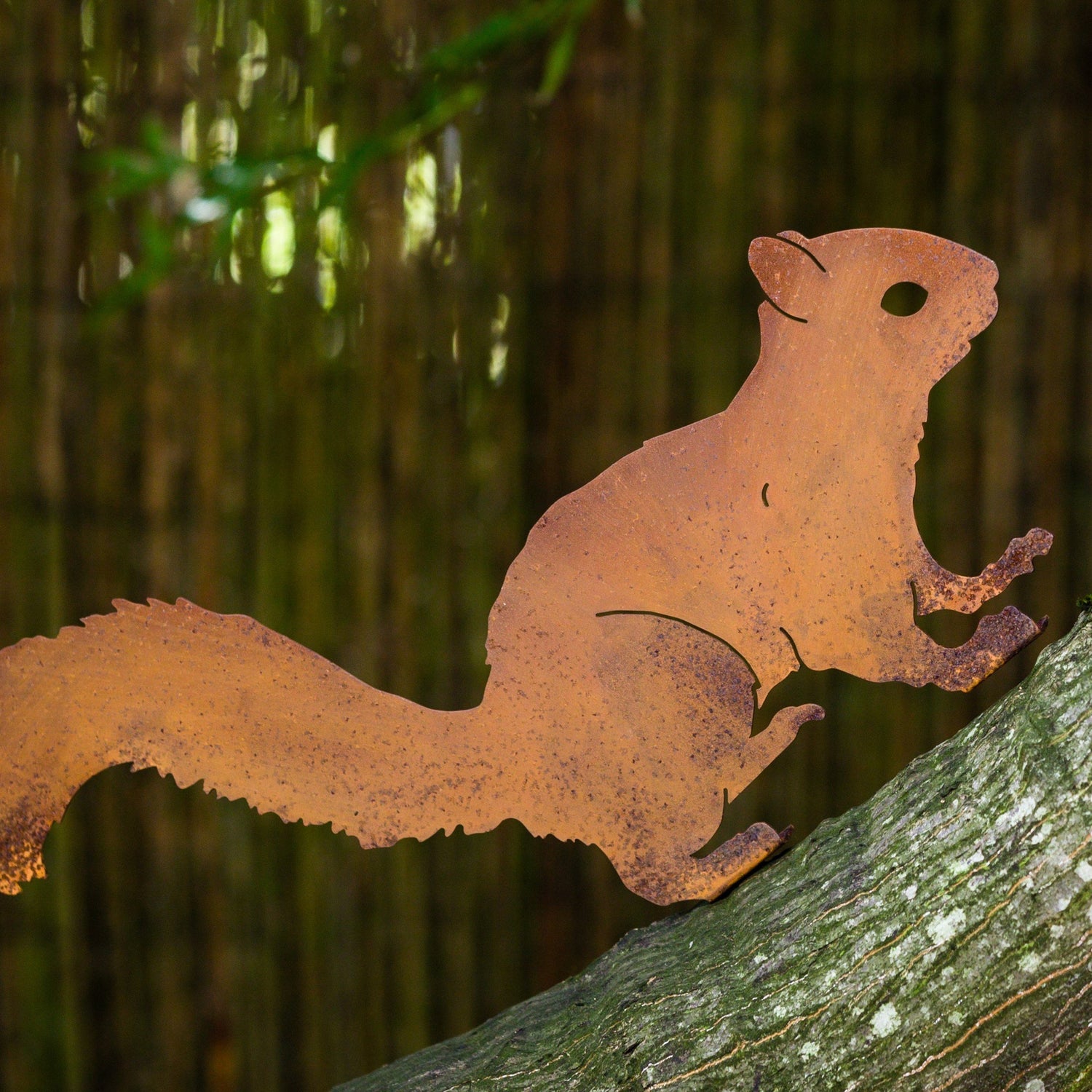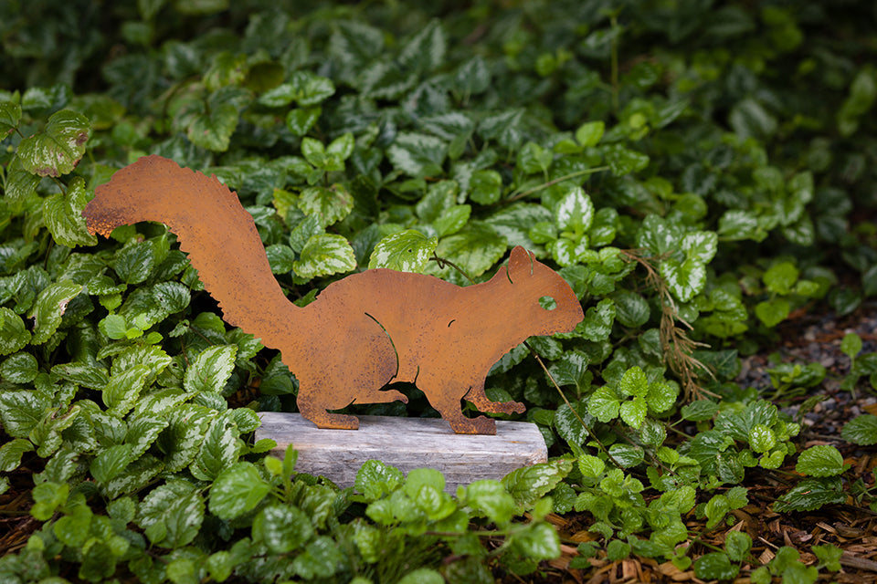 Our Alert Squirrel is the perfect piece to complete your nature-inspired backyard decor. If you’ve ever tried to hang a bird feeder, then you know that squirrels won’t be far behind! The silhouette of the Alert Squirrel is active as if it is preparing to run or carefully watching for predators. This piece is perfect to pair with other rusty birds decor pieces to complete the scene.
