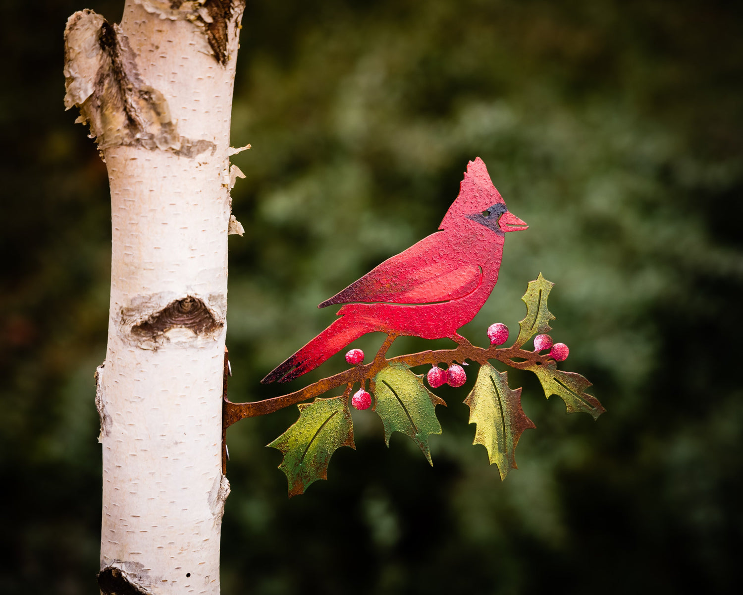 The Cardinal on Holly Branch is made of recycled steel and pre-treated to create our signature rusted texture. It is then hand-painted by our artists to create a stunning display for your yard or garden.