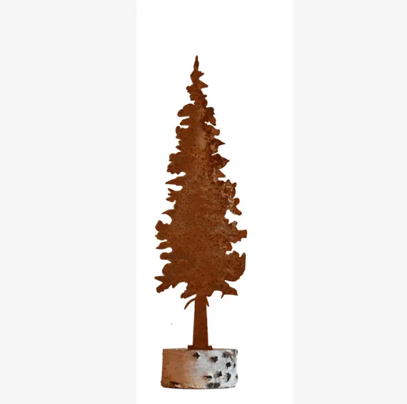 These Fir Trees are made of recycled steel and pre-treated to create our signature rusted texture and natural look. The metal fir trees look gorgeous when mounted onto a slice of hickory and displayed as a table centerpiece, indoors or outdoors. These metal silhouettes are perfect to add to a mountain cabin or lodge.