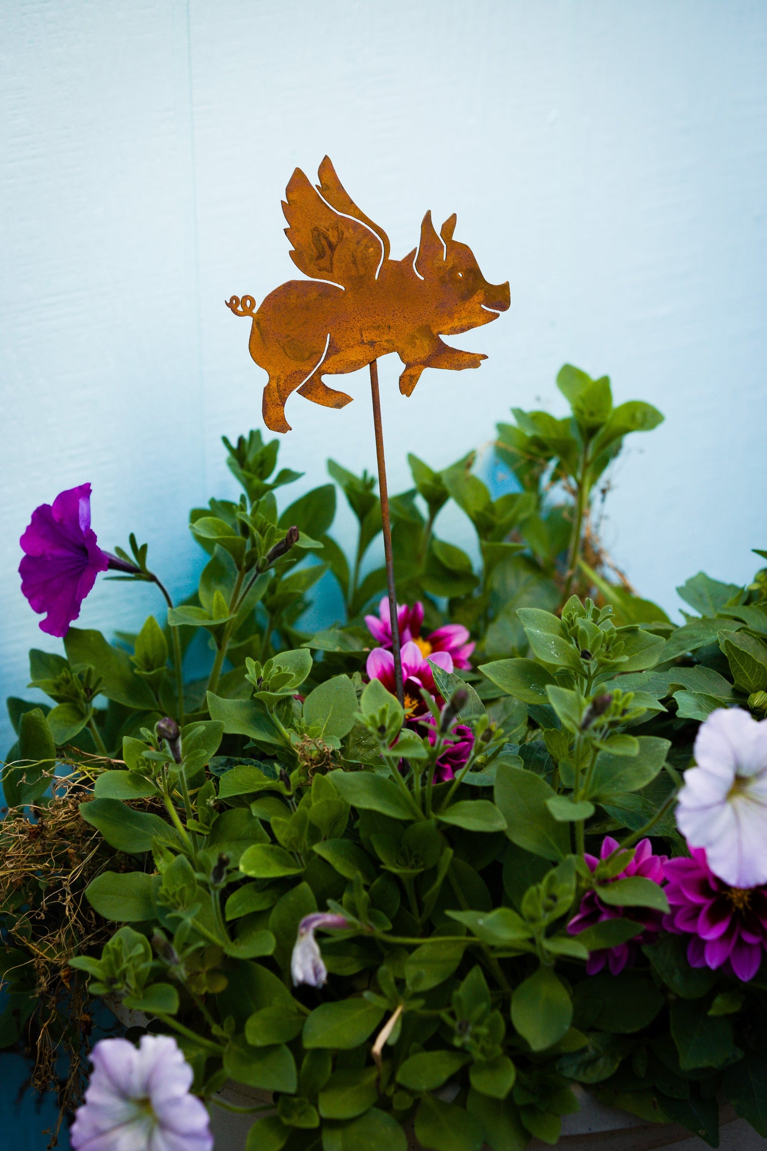 The Flying Pig Pick is made of recycled steel and pre-treated to create our signature rusted texture and vintage look. It would be the perfect accent for a flower bed or your favorite potted plant inside or outside of your home.