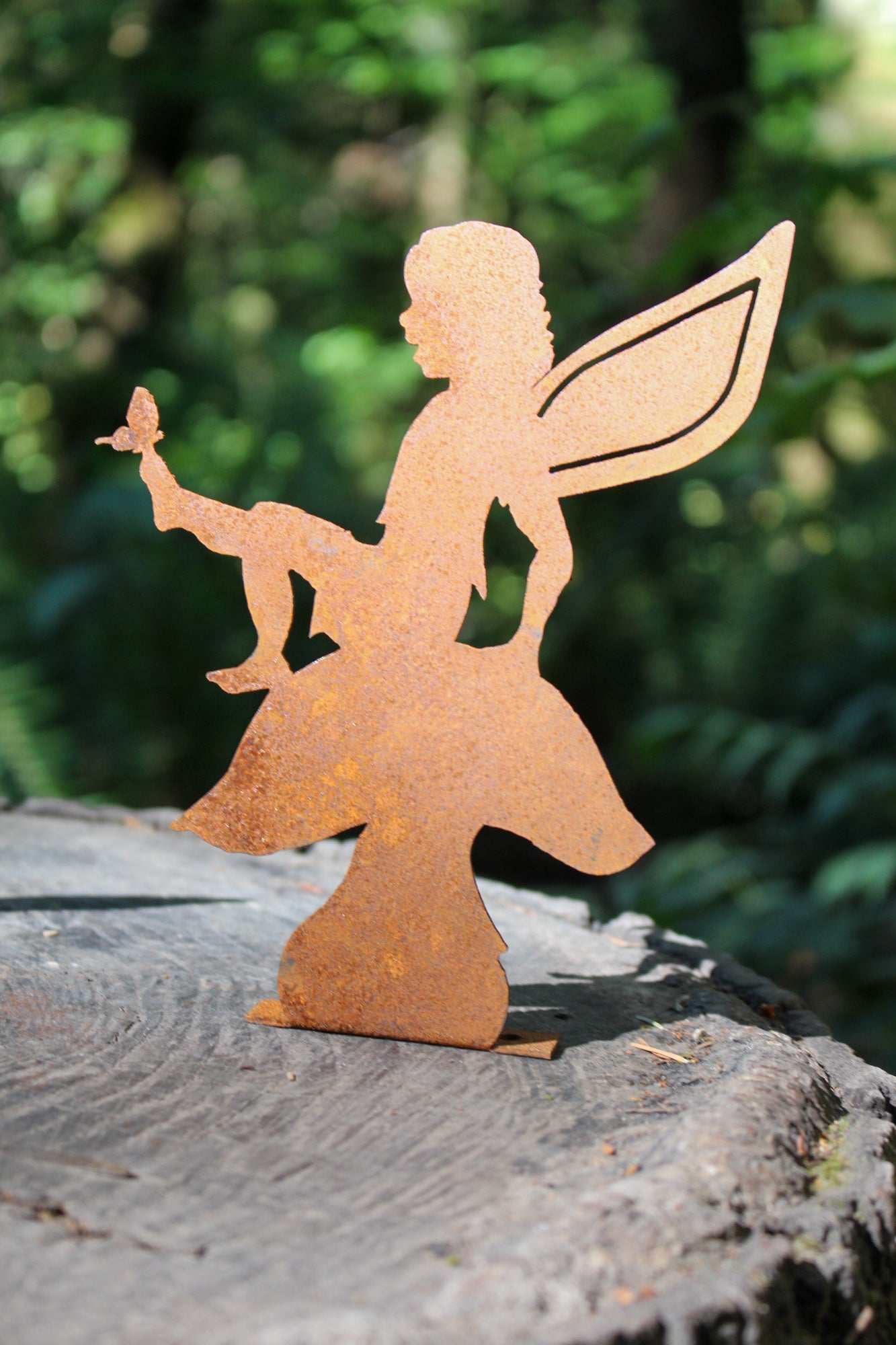 The Fairy on Mushroom is made of recycled steel and pre-treated to create our signature rusted texture and natural look. It would be the perfect whimsical accent along the border of a flower garden, mounted to a windowsill, or even displayed as a decor piece in a children’s bedroom!