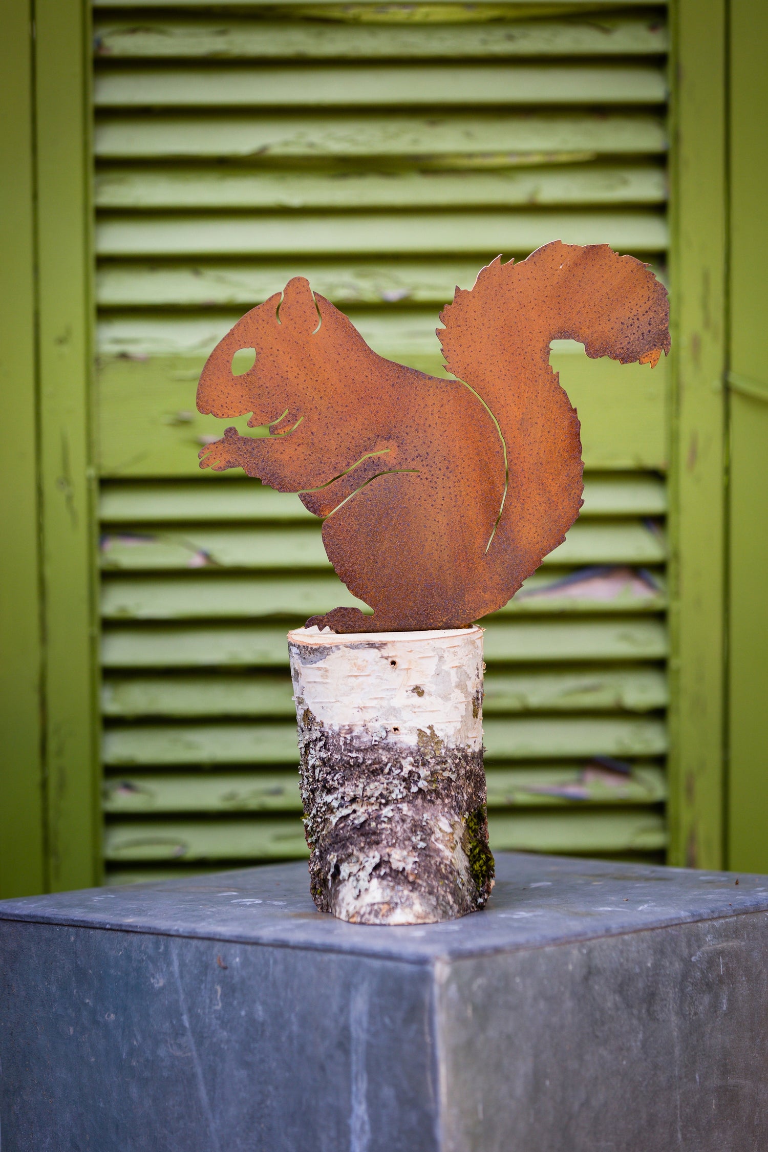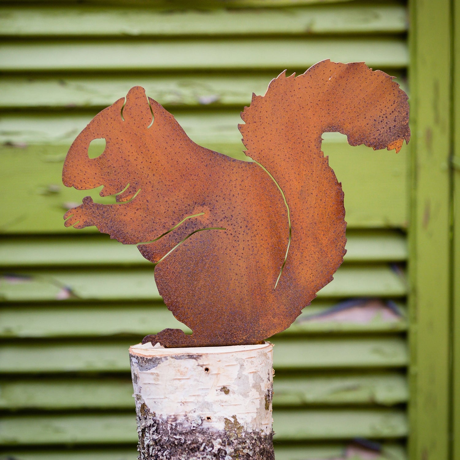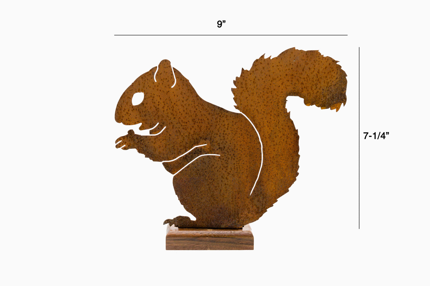 The Nibbling Squirrel is made of recycled steel and pre-treated to create our signature rusted texture and natural look. It would be the perfect accent perched along a fence post, on a tree branch or log, or even attached to a wooden slab and displayed as interior decor.