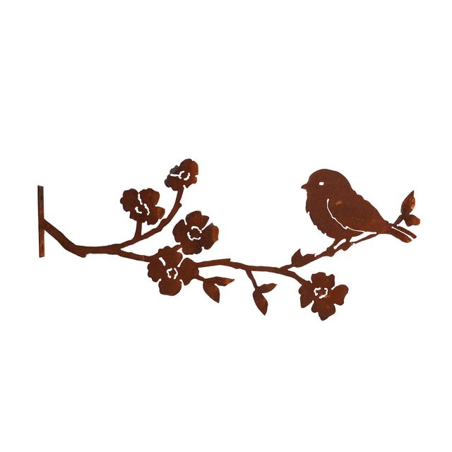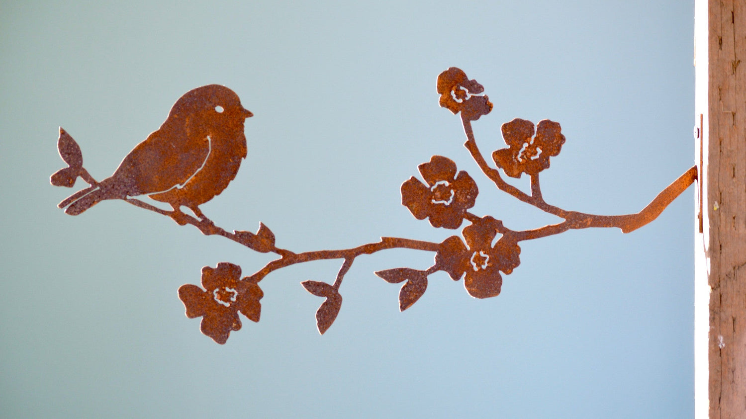 The Chickadee on Dogwood Branch is made of recycled steel and pre-treated to create our signature rusted texture and vintage look. It looks best mounted to a vertical surface, such as a fence post, a backyard pergola, or even the trunk of your favorite shade tree in your backyard.