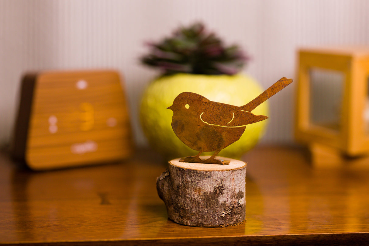 The Fat Chickadee is made of recycled steel and pre-treated to create our signature rusted texture and natural look. Many chickadees even have feathers containing rust-like hues! The curated piece of artwork is a charming accent along a windowsill, perched on a fence post, or attached to a pedestal or other surface of your choice to display inside your home.