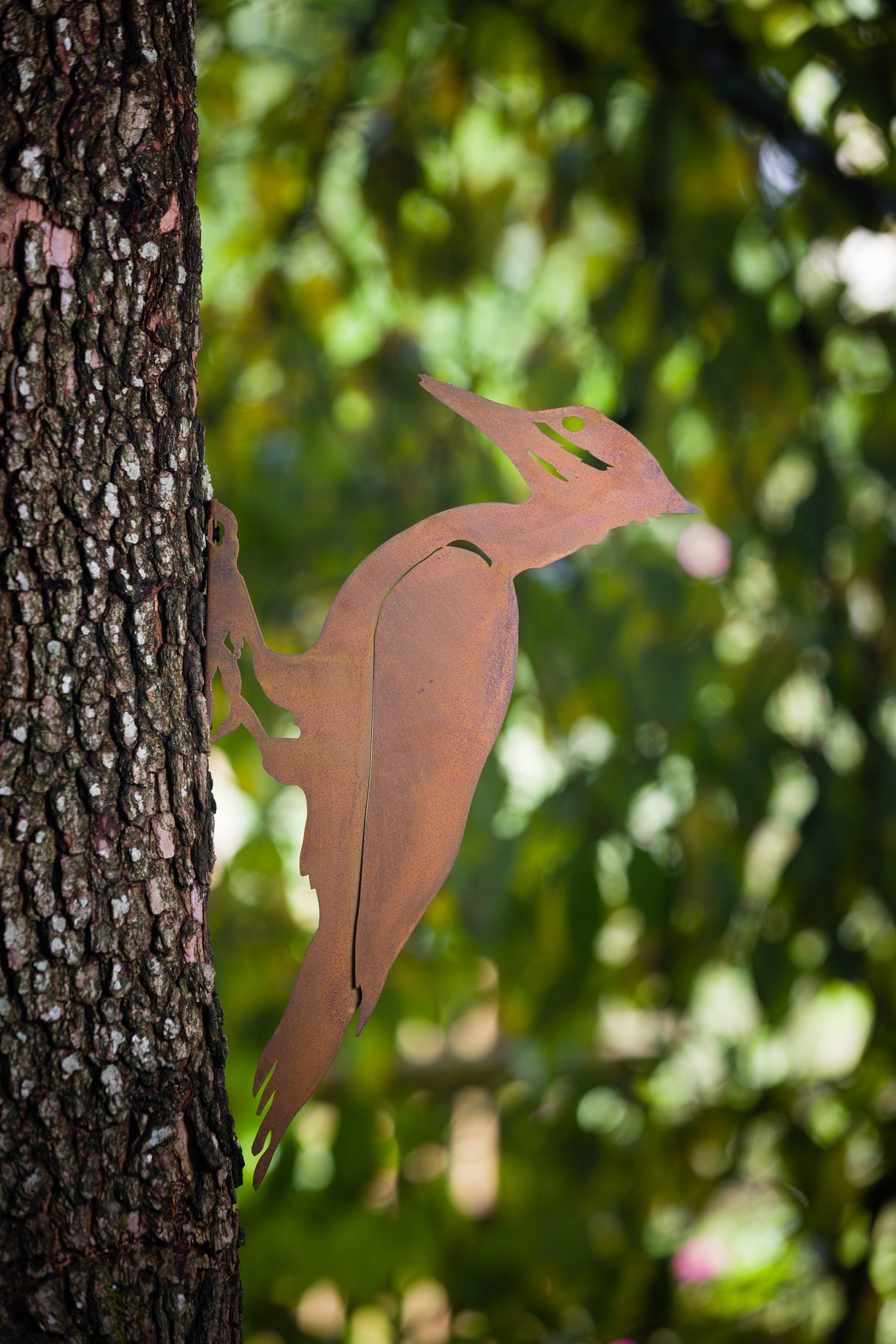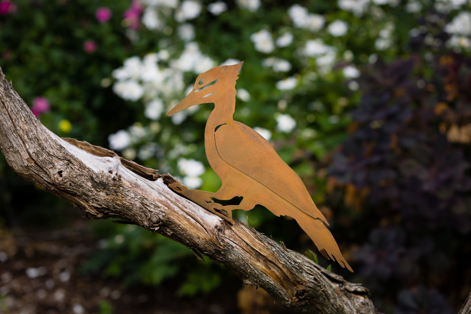 Pileated woodpeckers are some of the largest forest-dwelling birds in all of North America. Our metal garden art depicts a life-sized silhouette of these distinctive creatures. The holes created by woodpeckers in trees and logs often serve as shelter for other creatures, such as Nuthatches.