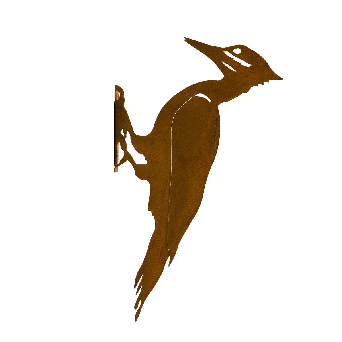 The Pileated Woodpecker is made of recycled steel and pre-treated to create our signature rusted texture and vintage look. Its vertical orientation looks excellent installed along a fence post, on a tree trunk, or even on the side of a bookshelf or wall for nature-inspired interior decor.