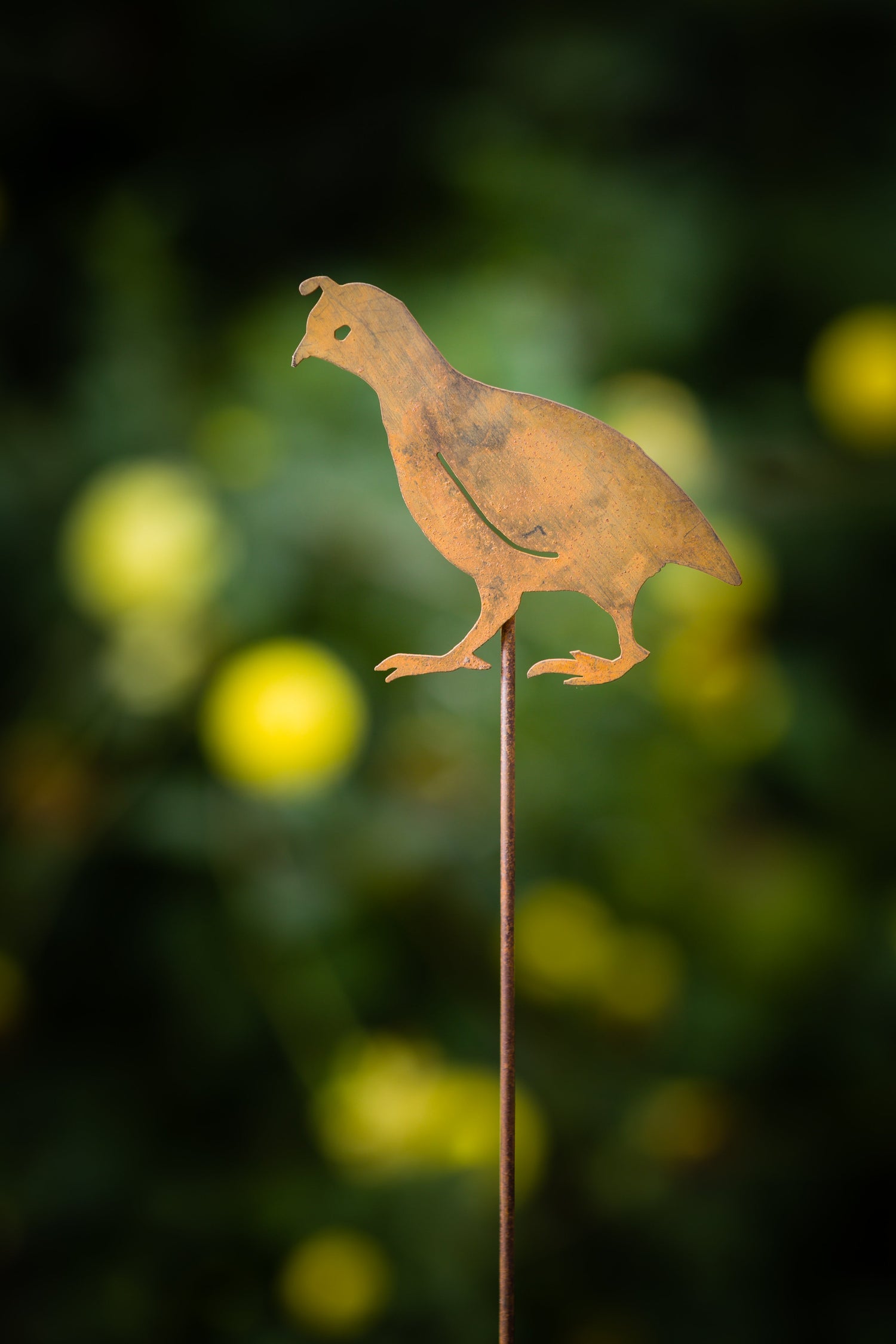 Cut from 16-gauge recycled steel and securely welded to a metal garden stake, this baby quail has been pre-treated to give it an authentic rusted surface.
