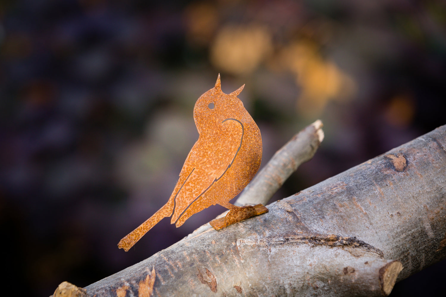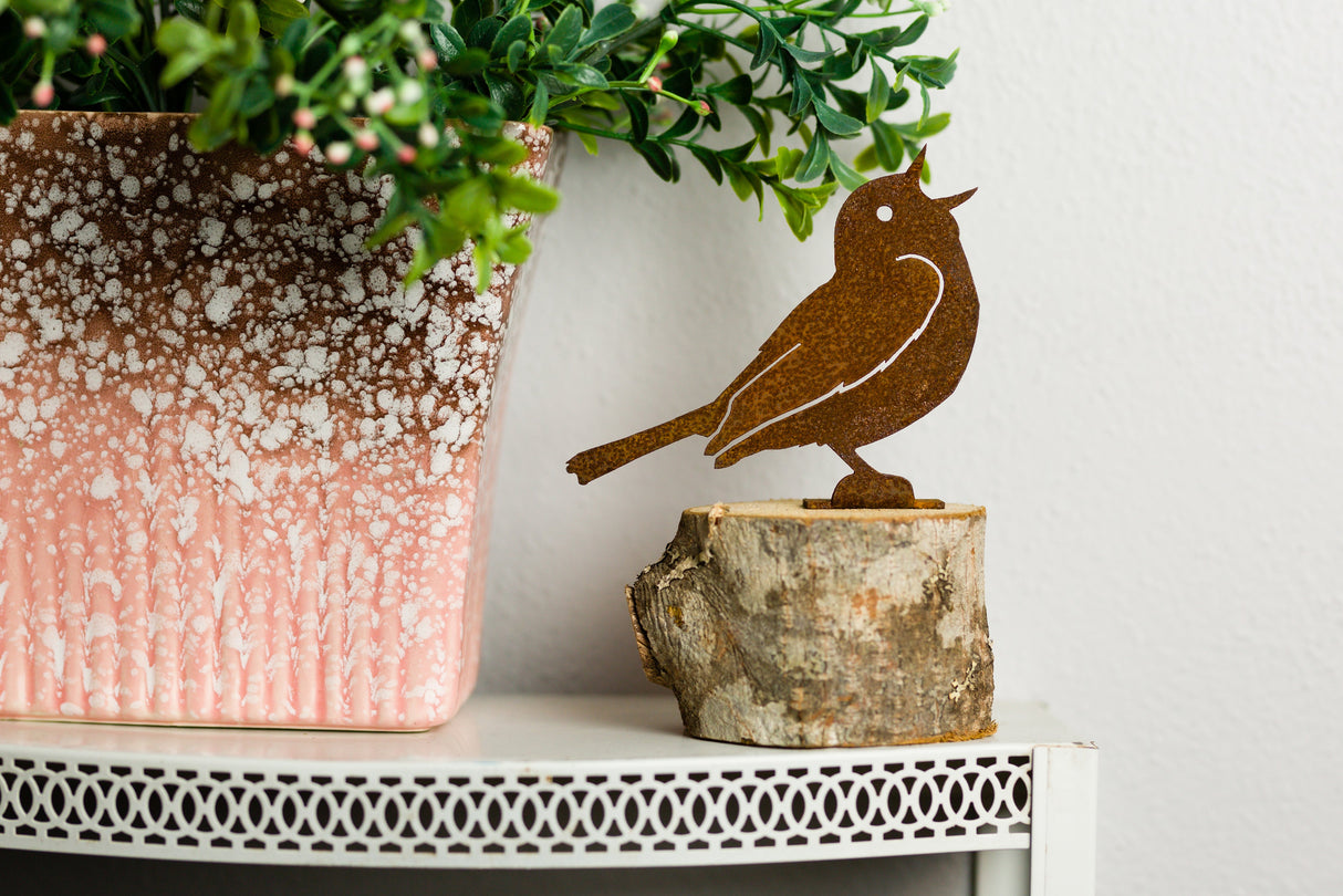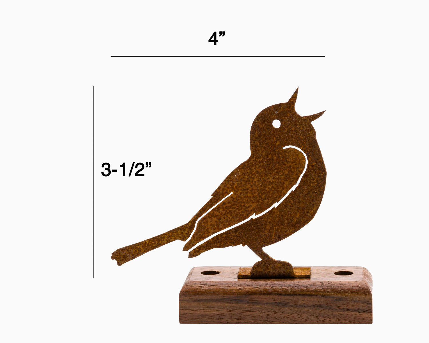 The Singing Warbler is made of recycled steel and pre-treated to create our signature rusted texture and natural look. The auburn hue of the rusted finish beautifully complements lush greenery when displayed outdoors!