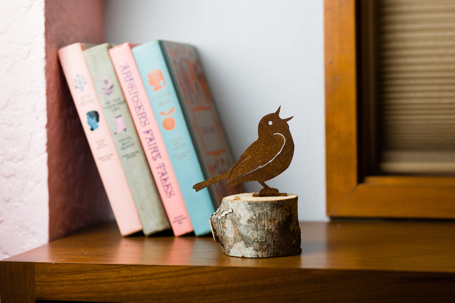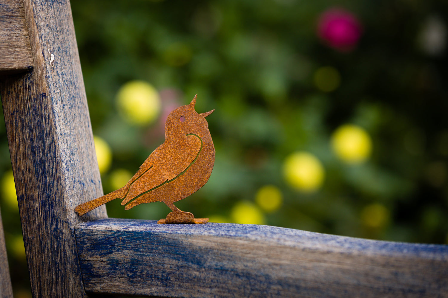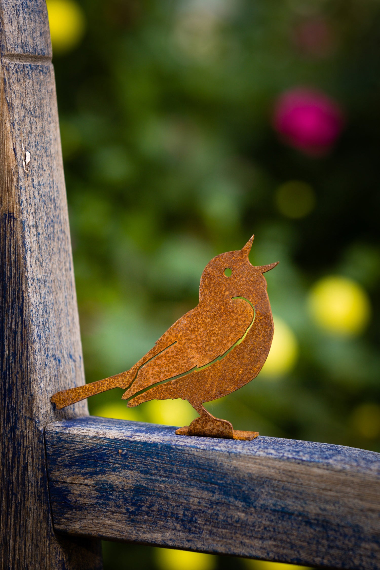 The Singing Warbler is made of recycled steel and pre-treated to create our signature rusted texture and natural look. The auburn hue of the rusted finish beautifully complements lush greenery when displayed outdoors!