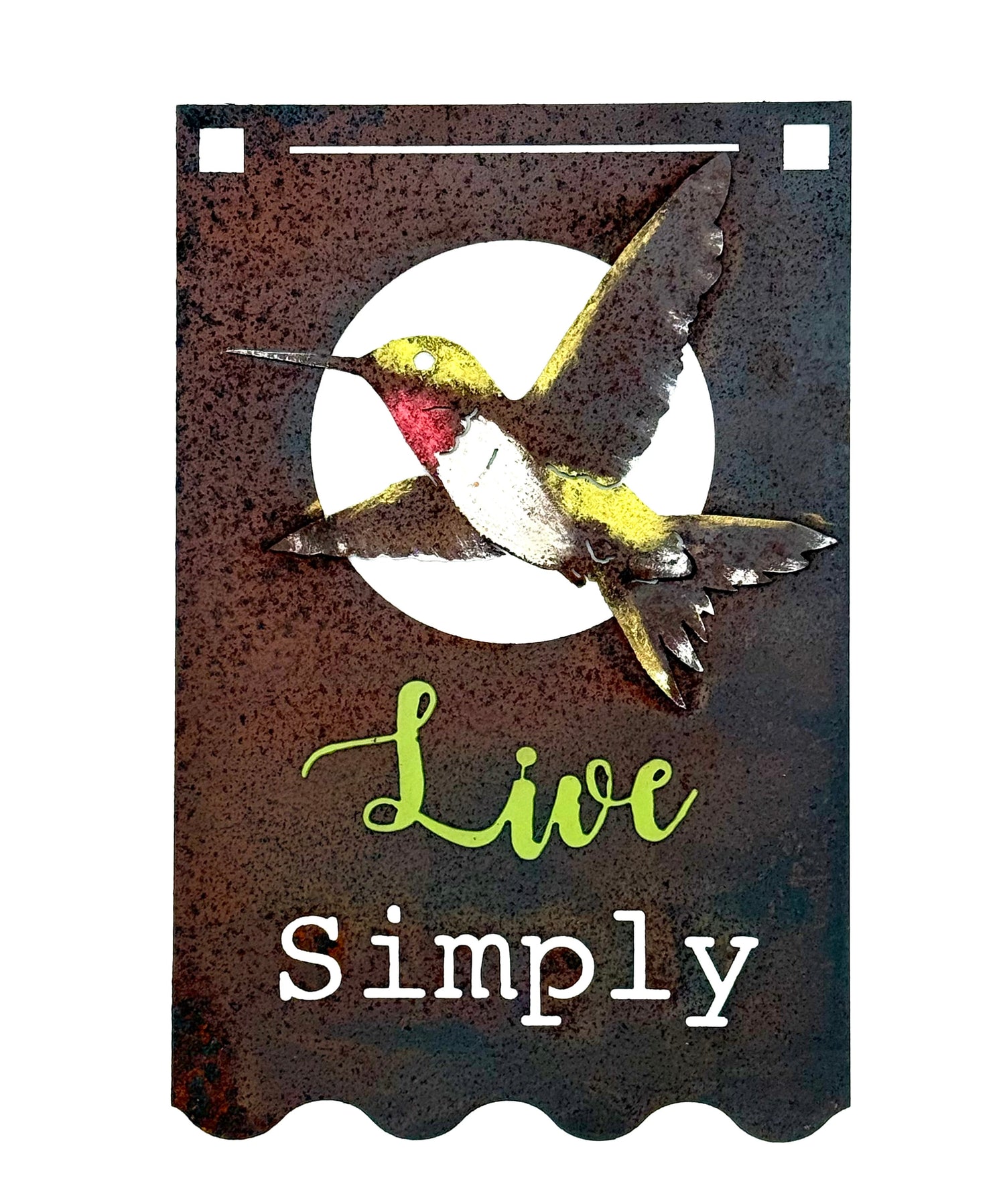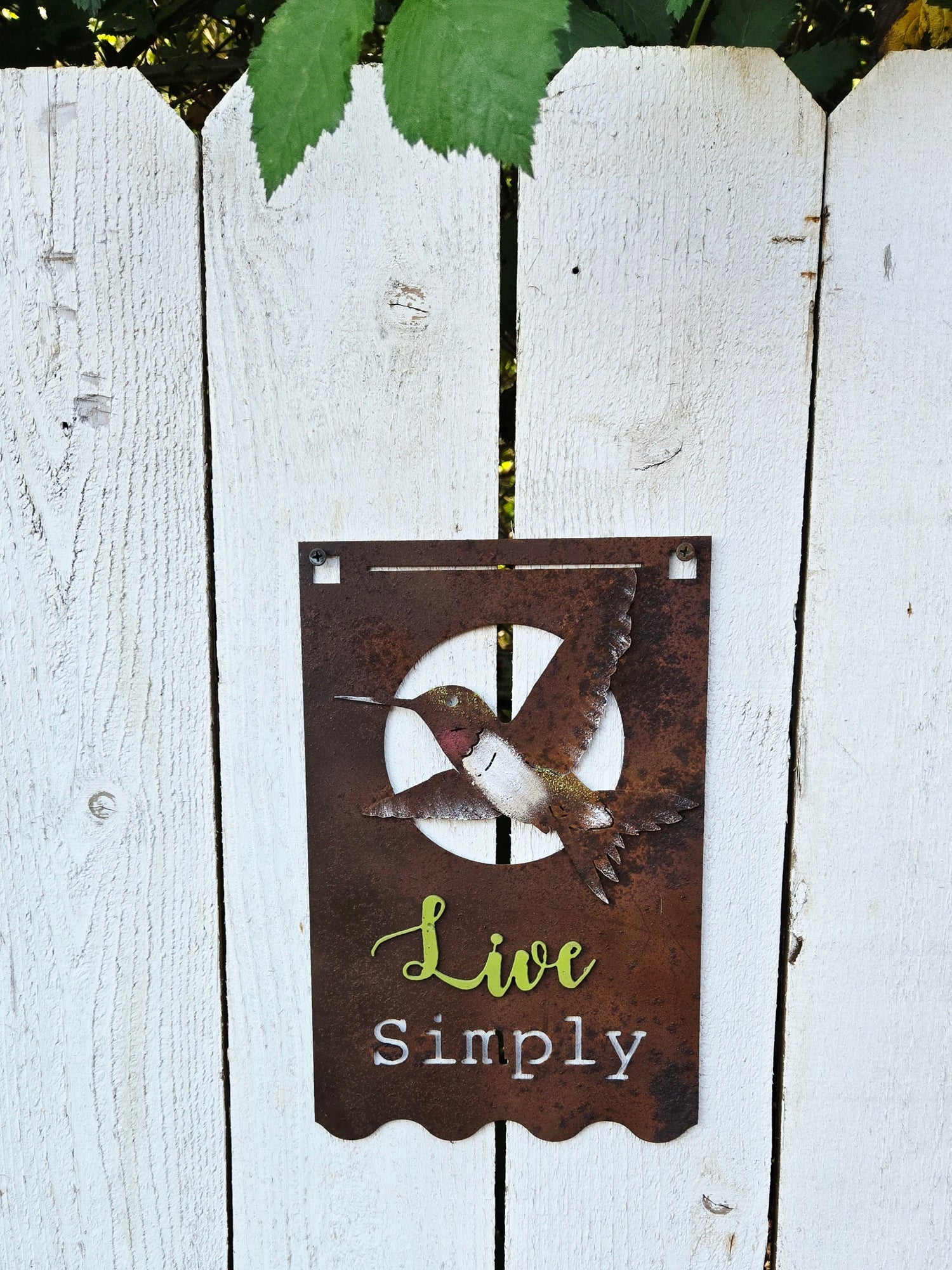 Bring calm and charm to your space with this elegant Metal Wall Art showcasing a delicate hummingbird and the inspiring phrase "Live Simply." Expertly crafted from recycled steel, this piece blends natural beauty with minimalist design, creating a peaceful focal point for any room or outdoor area.