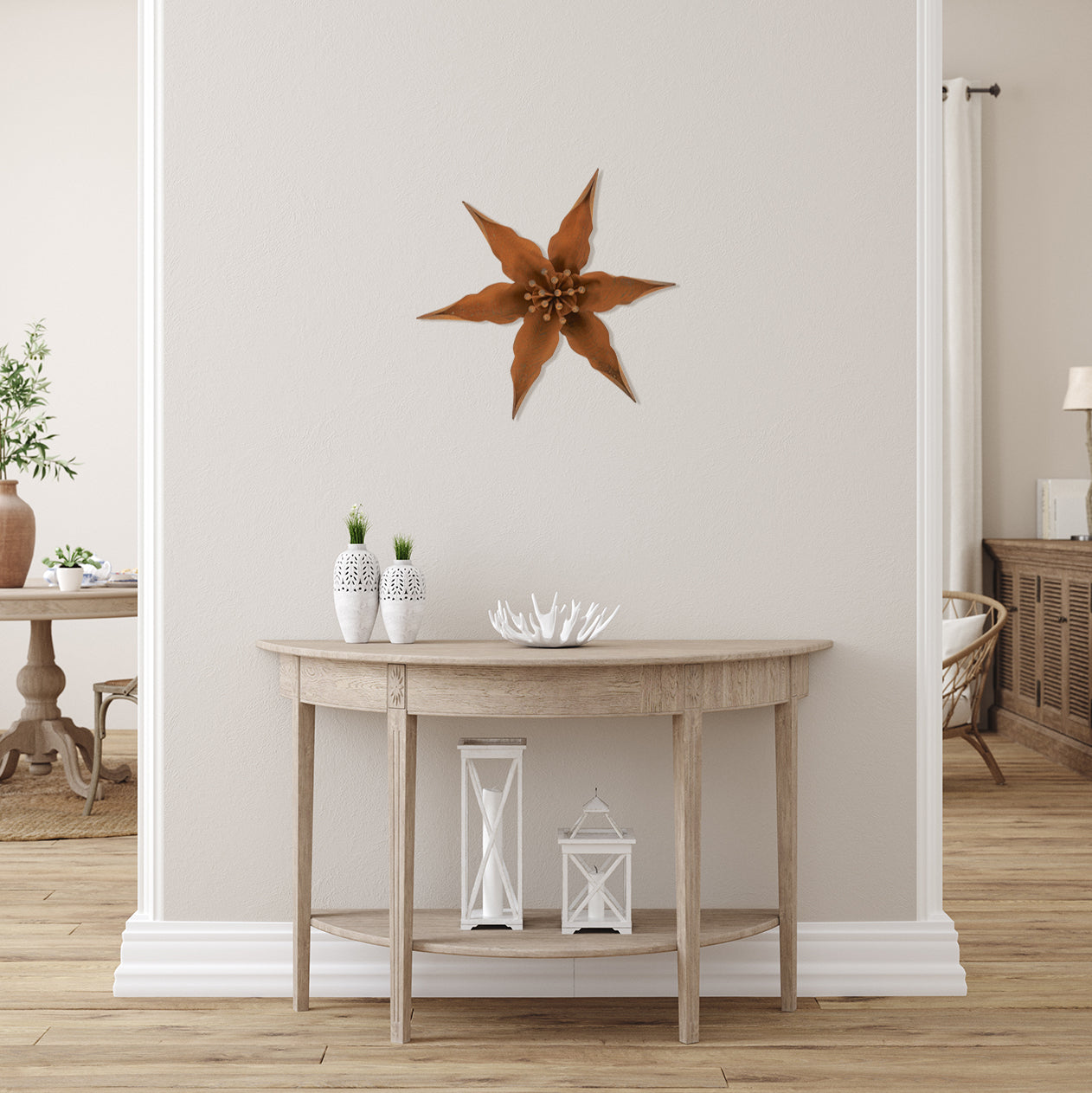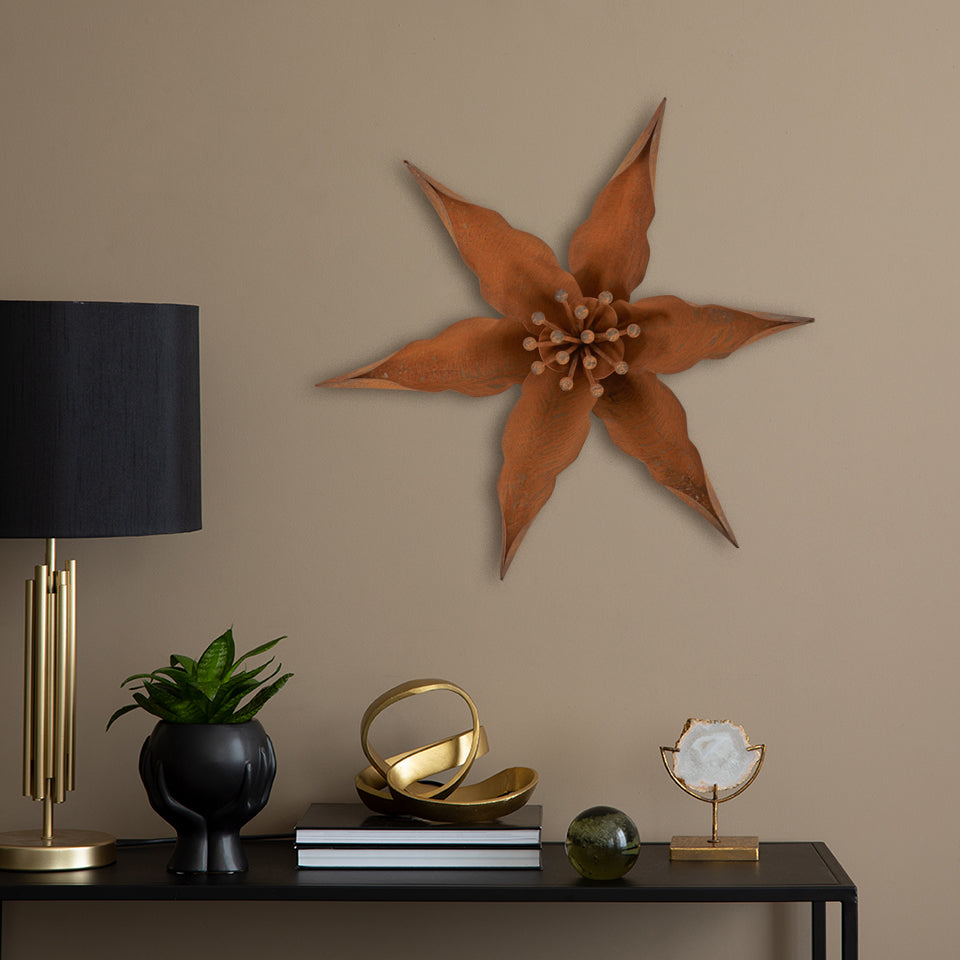 Mira captivates with its elegant, flowing design and earthy patina finish. This wall-mounted steel sculpture draws inspiration from nature, with an abstract form that suggests the soft curves of a flower. The unique patina process gives Mira a rich, textured look, with varying shades of brown and rust that change with the light. Its delicate, graceful shape adds a touch of organic beauty to any room, while the abstract design keeps it modern and fresh. Perfect for those who appreciate understated elegance, Mira is a timeless addition to any space.