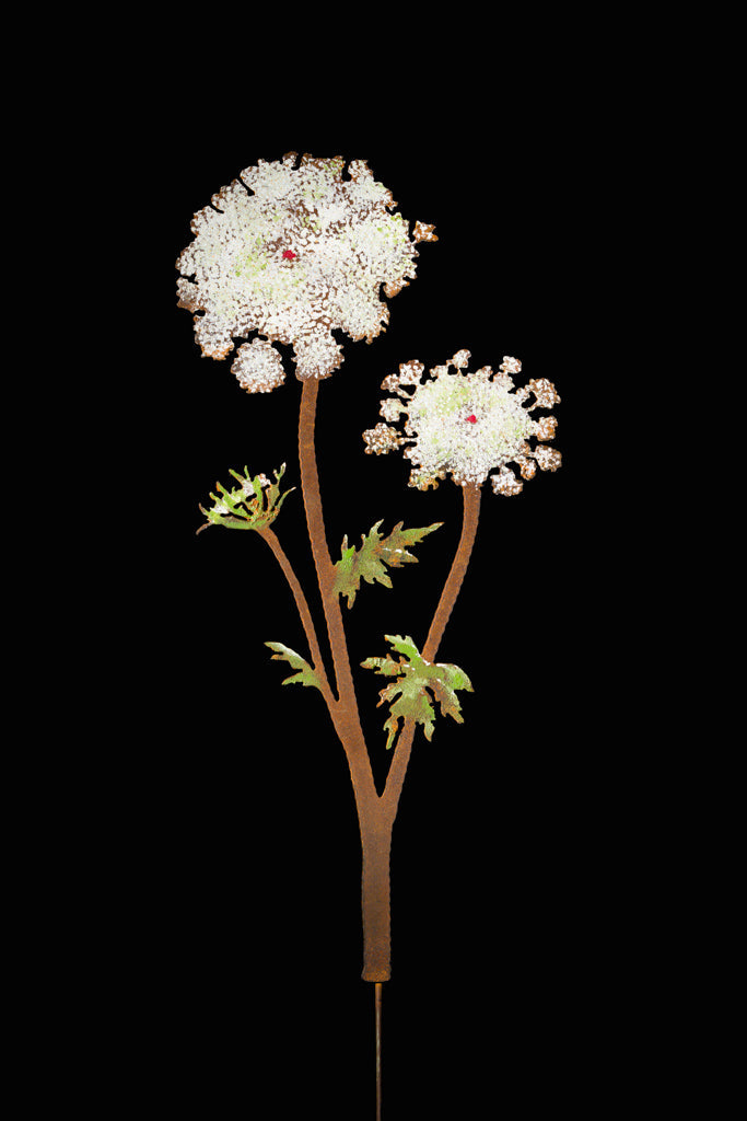Crafted from durable metal, this garden yard art piece is built to withstand the elements and maintain its beauty over time. The silhouette of the Queen Anne's Lace flower is intricately cut from the metal, creating a visually captivating design that showcases the intricate details of the flower.
