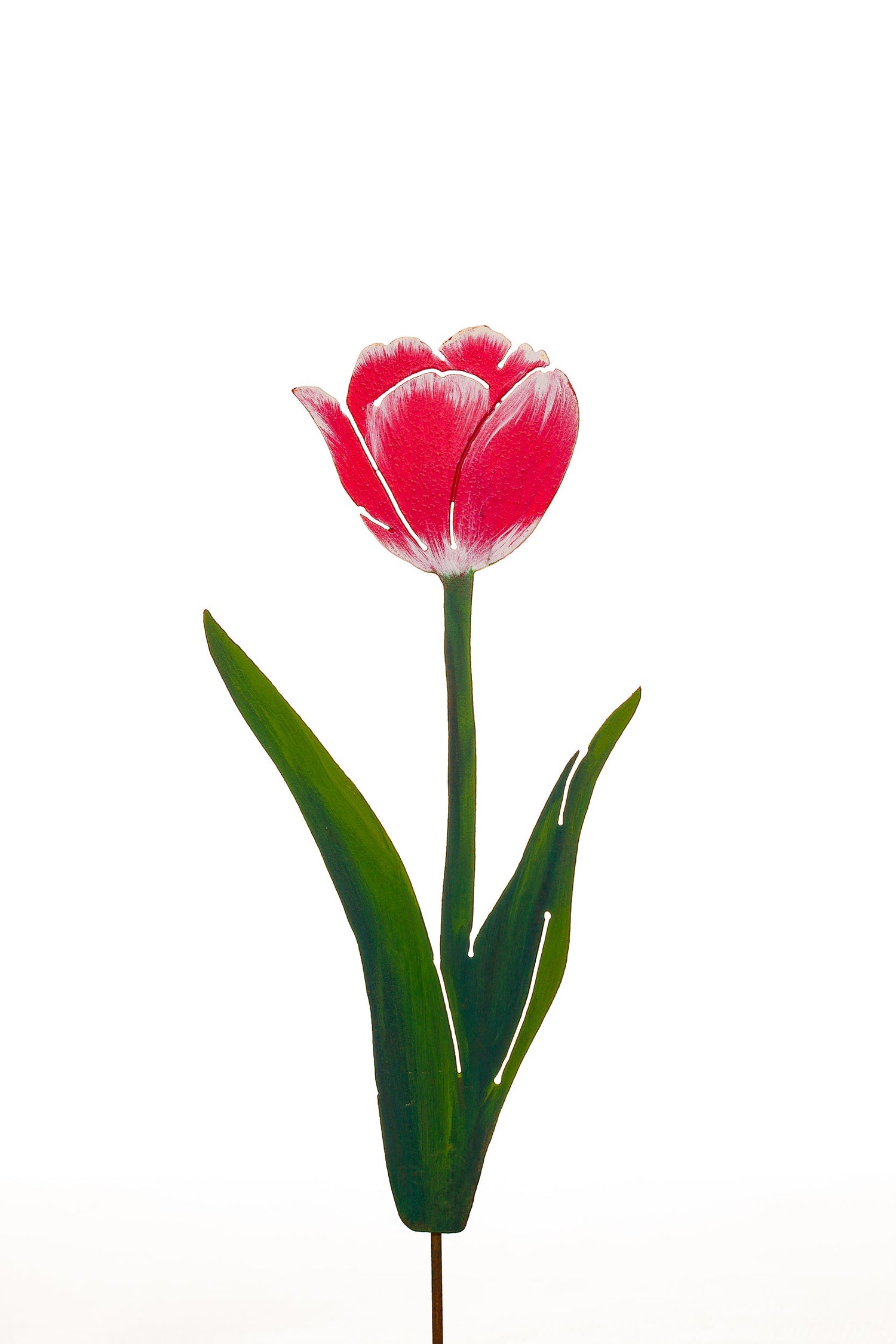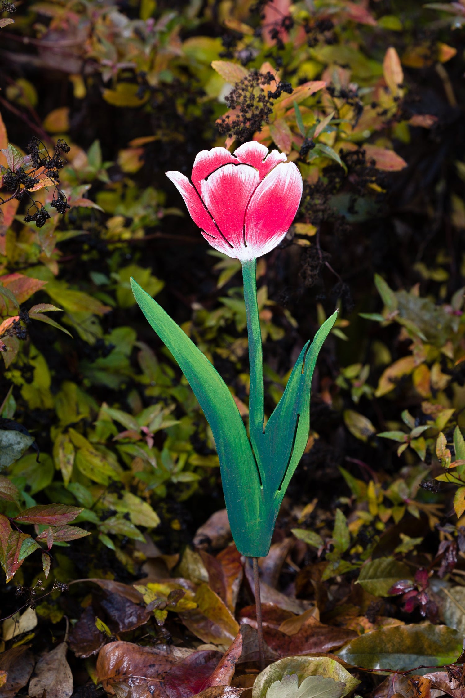 Our Timeless Pink and Red Tulip metal garden art picks insert easily into soft ground. Be mindful of rocks and roots that may catch the metal pick, and adjust the depth as needed.